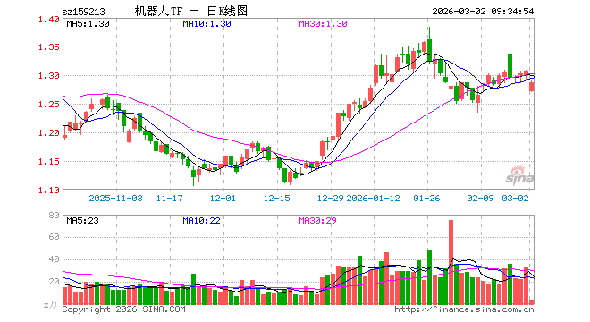 3月2日,机器人ETF汇添富(159213)开盘跌2.75%,报1.271元。机器人ETF汇添富(159213)重仓股方面,科大讯飞开盘跌1.90%,汇川技术跌1.60%,拓普集团跌2.68%,大华股份跌1.56%,大族激光跌1.80%,双环传动跌2.51%,石头科技跌1.00%,中控技术跌2.74%,绿的谐波跌3.60%,机器人跌2.40%。