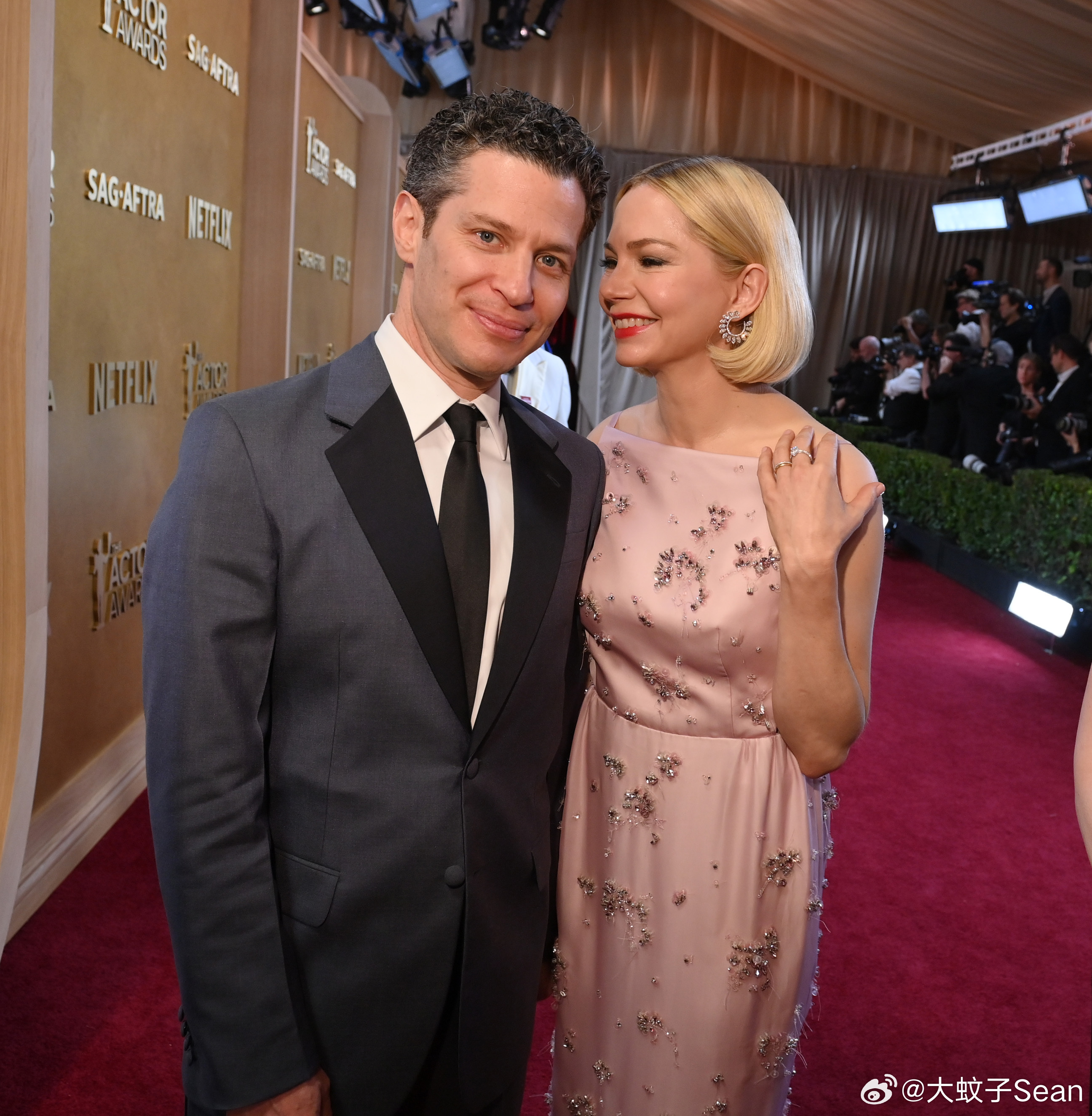 Michelle Williams米歇尔威廉姆斯在洛杉矶出席第32届演员工会奖颁奖礼,小米和老公Thomas Kail一起恩爱亮相,场内还和石头合了影
