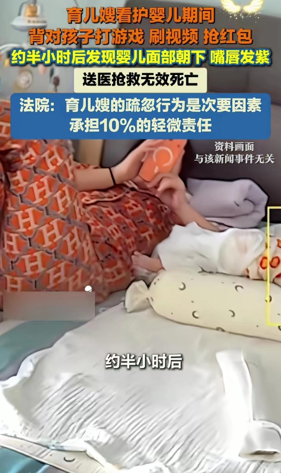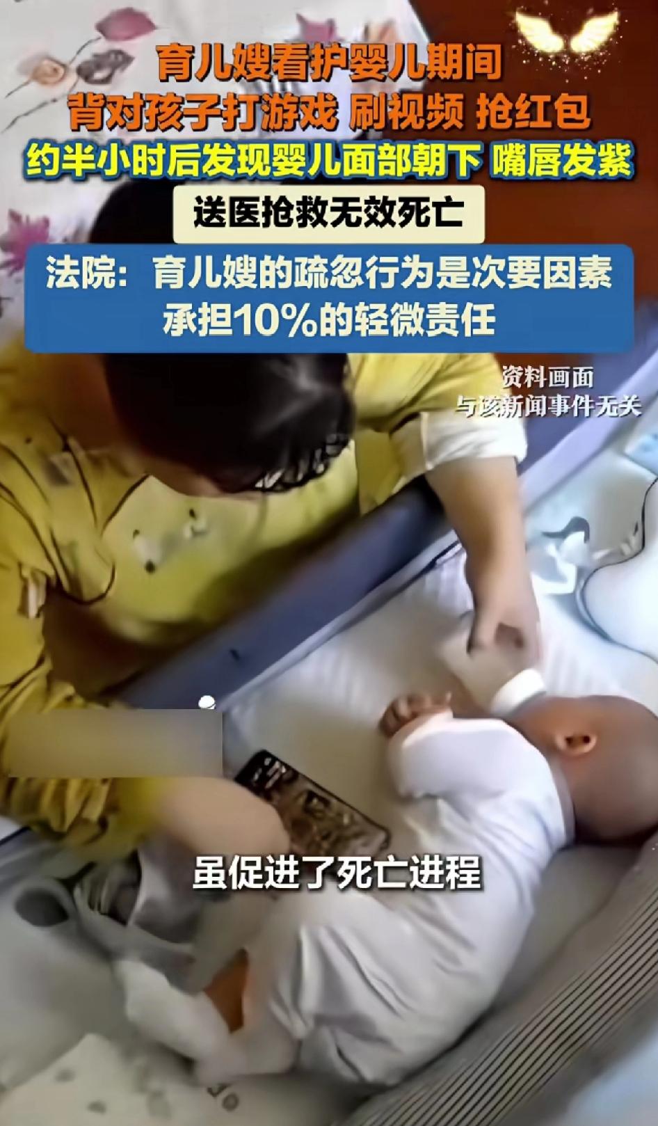育儿嫂看护婴儿期间背对孩子打游戏、刷视频、抢红包,约半个小时后发现婴儿面部朝下、嘴唇发紫,送医抢救无效死亡。 2024年6月,育儿嫂张某受雇照顾婴儿蒋某,蒋家人工作都很忙,但孩子才两个月,正是需要人照顾的时候,蒋家人看张某做事也细心、周到便放心的把孩子蒋某交给了张某照顾。 一开始张某不敢马虎,雇主家的孩子才2个月大,而且这个孩子还有一些自身的疾病,当然得仔仔细细的好好照顾。 于是,张某总是把孩子的奶粉冲的刚刚好,总是把孩子的衣服洗的干干净净,蒋家的人看她这么能干最终还是彻底放了心。 可久而久之,张某也越来越放松,这个时候的张某觉得已经完全取得了家长的信任,并且感觉照顾孩子其实也是个再简单不过的事,慢慢的就不如之前那样勤勤恳恳、任劳任怨的了。 8月的一天,她把生病的蒋某放床上后,就自顾自背对孩子玩起手机,打游戏、刷视频、抢红包。 一开始她把孩子头侧向一边,发现面部朝下还调整了下,可之后就完全沉浸在手机里。 过了一会,张某的群里又开始有人发红包,这样的机会张某哪里舍得放过,立刻便把小蒋某忘了个一干二净。 约20 - 30分钟后,才发现孩子面部朝下、嘴唇发紫,当张某发现蒋某嘴唇发紫并送医抢救后,送医后孩子还是没抢救过来。 蒋某家人索赔33万余元,后来,经市、区级检察机关和公安机关针对蒋某死亡案件会商,认为事发时蒋某患有疾病,在死亡过程中,育儿嫂张某的不当看护致死者长时间处于趴卧状态,该状态可能造成胸腹部呼吸肌运动受限、口鼻部呼吸道口部分阻塞等情况,加剧呼吸功能障碍,不排除在一定程度上会促进呼吸衰竭的进程。 虽张某已补偿3万,但一审法院还是判她再赔13万多。不过法院认定她的疏忽是次要因素,只承担10%责任。 孩子家属认为,育儿嫂张某长时间、持续低头专注于操作自己的手机,包括打游戏、聊天、刷视频、抢红包等,完全忽视其对正在睡眠中婴儿的必要观察和监护责任,严重违反了约定及基本职业操守,未尽到其应负的高度注意义务和安全保障职责。 这育儿嫂太不负责了,看护婴儿时咋能只顾自己玩手机呢,希望行业能加强监管,保障婴儿安全。