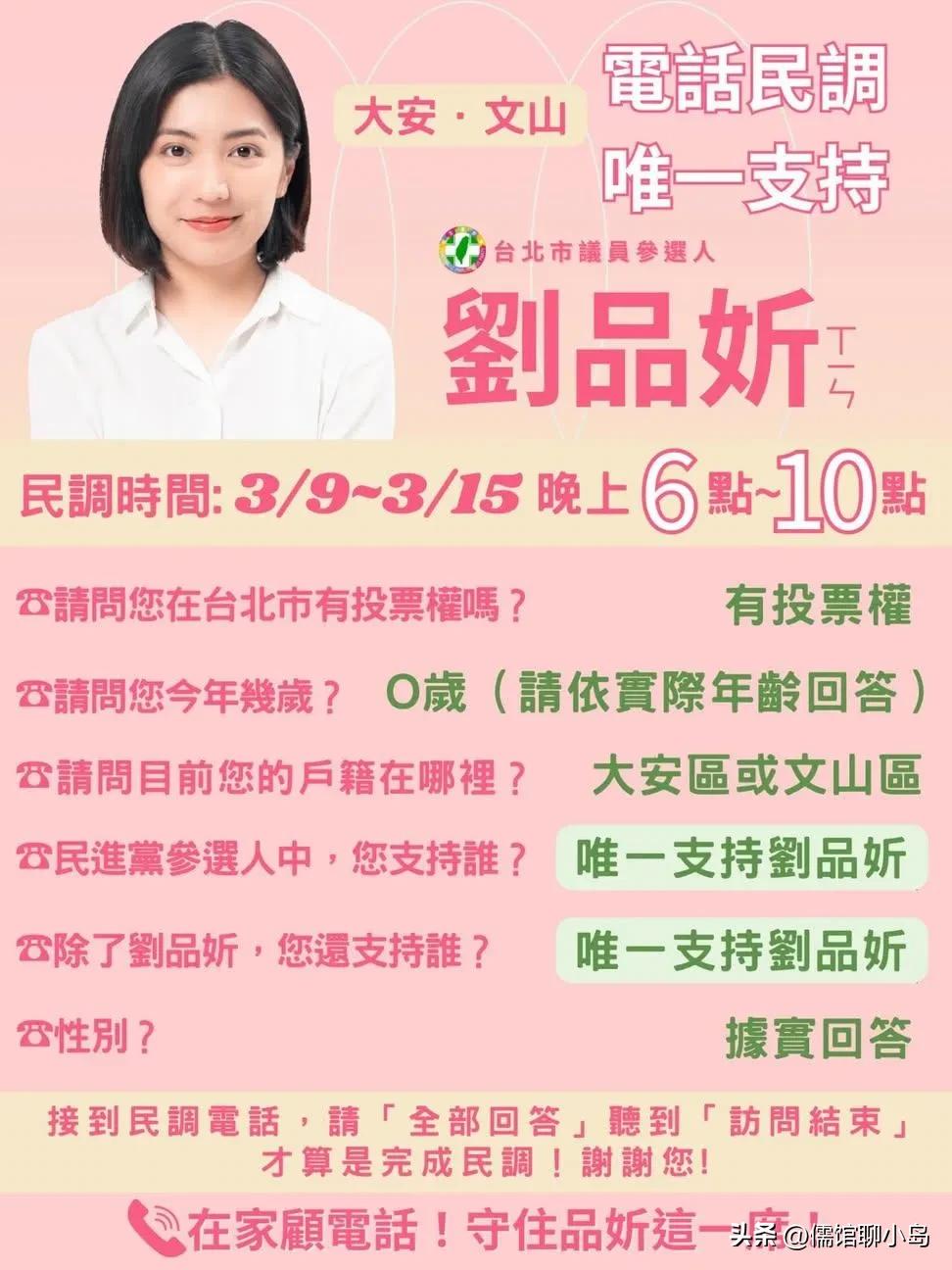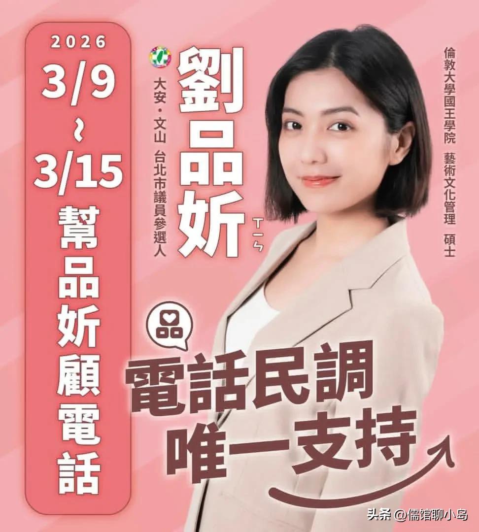 民进党新人刘品妡完成初选登记,主打“人本美学”进军台北市议会 2026年台北市议员选举战况渐趋激烈,民进党新人刘品妡于近日正式完成党内初选登记,全力争取代表党参选大安区与文山区议员的机会。她以“文化台北、人本交通、教育发展、全龄友善”四大愿景为核心,强调将艺术美学与人文关怀带入地方政治,展现出鲜明的世代交替诉求。 作为民进党“涌言会”重点推出的新生代参选人,刘品妡拥有艺术与文化管理的专业背景。她曾在“立院”及前台北市议员赵怡翔的服务团队中历练,积累了政策分析与基层服务的实务经验。刘品妡表示,过去在产业界的工作让她深刻体认到结构性问题,因此选择主动投身政治体系,从幕僚做起,学习如何将制度转化为实际的社会改变。 在竞选政见上,刘品妡主打“人本美学”,主张政策不应只是冷冰冰的条文,而应是能被市民实际感受、使用并信任的生活日常。她希望承接前辈如阮昭雄、赵怡翔等人的努力,将一线经验转化为更贴近生活的市政规划,尤其关注教育、交通及高龄化社会下的全龄友善环境。 目前民进党台北市议员初选已进入电话民调阶段,刘品妡团队正积极拜票,呼吁支持者在民调中支持她,争取胜出代表党籍参选的机会。面对年底的选战,这位政坛新秀能否凭借清新形象与专业背景成功突围,备受外界关注。 这个是真喜欢,台湾正妹还是漂亮的。