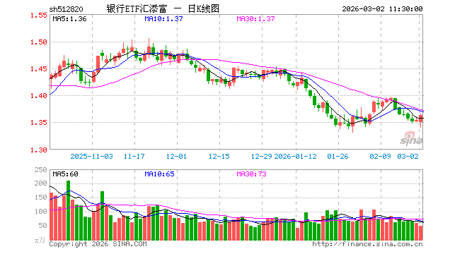 3月2日,截止午间收盘,银行ETF汇添富(512820)涨0.66%,报1.363元,成交额6691.46万元。银行ETF汇添富(512820)重仓股方面,招商银行截止午盘跌0.05%,兴业银行涨0.33%,工商银行涨0.58%,农业银行涨1.87%,交通银行涨0.61%,浦发银行涨0.00%,江苏银行涨0.97%,平安银行跌0.28%,上海银行涨0.62%,民生银行涨1.29%。