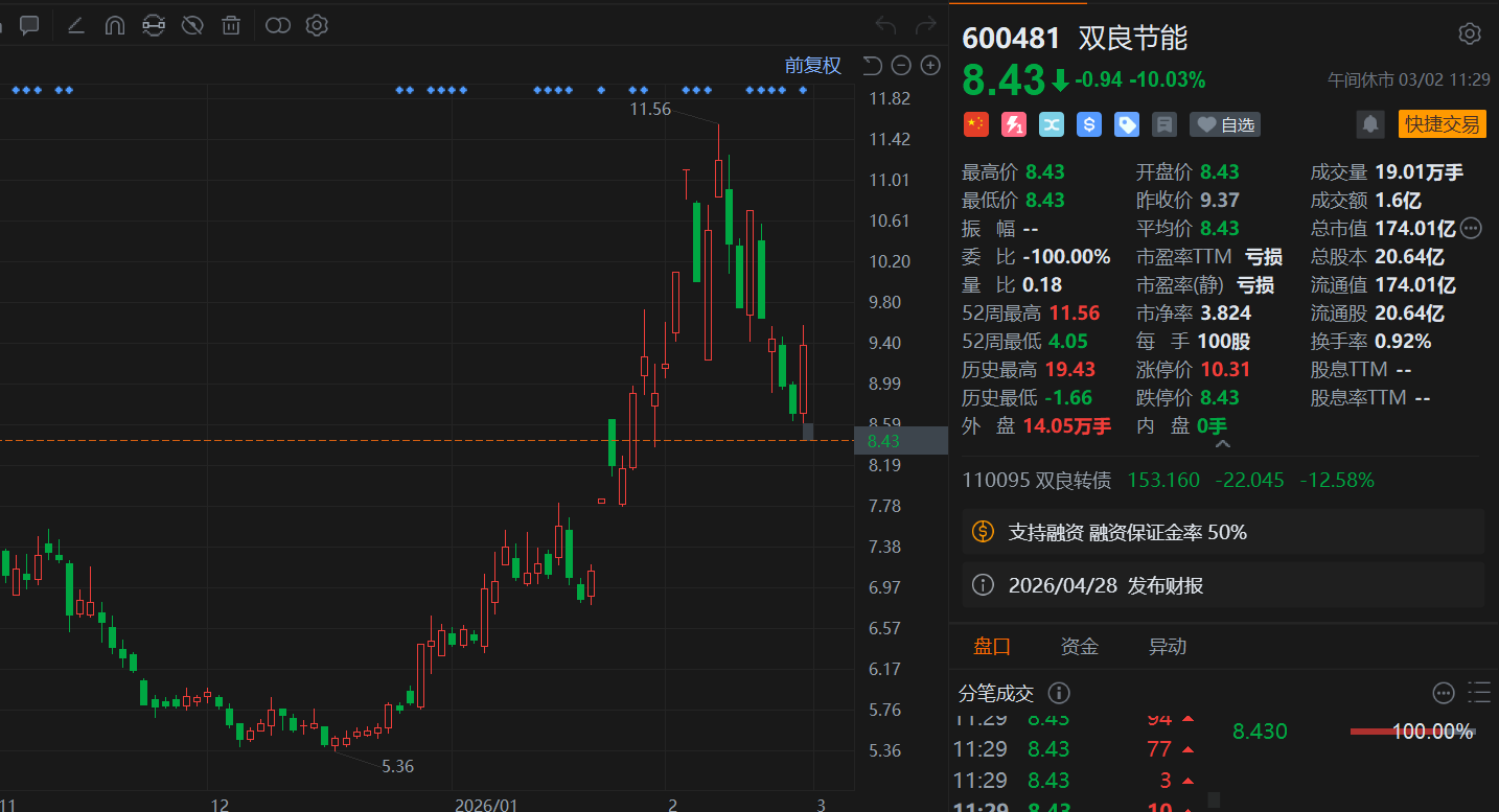 双良节能(600481.SH)一字板跌停,目前封单金额超7亿元,报8.43元,总市值174亿元。消息上,双良节能上周五晚间公告,涉嫌信披违规被证监会立案公告,公司于2026年2月27日收到中国证券监督管理委员会下发的《立案告知书》。有分析称,而就在半个月前,天合光能刚因同款操作被上交所出具警示函。事实证明:靠概念炒作上天,终会遭遇引力反噬。