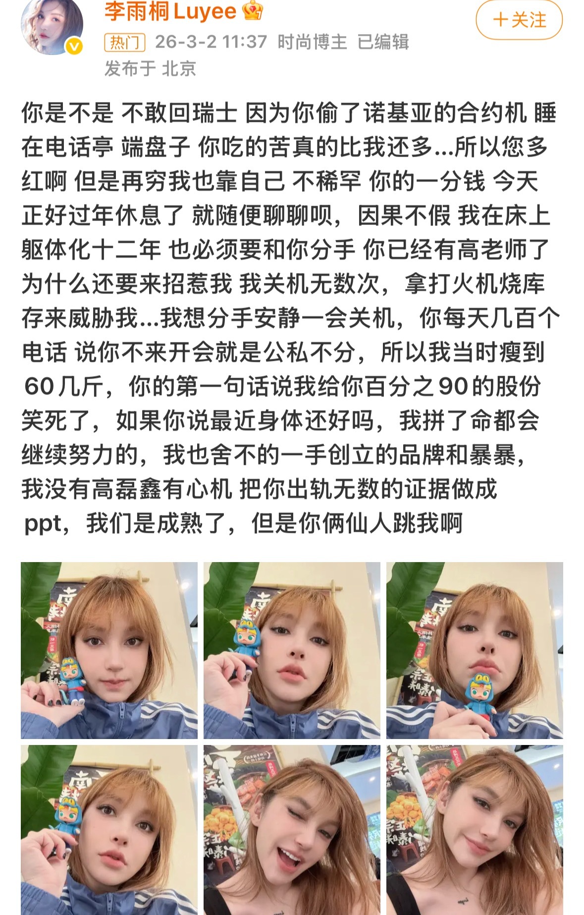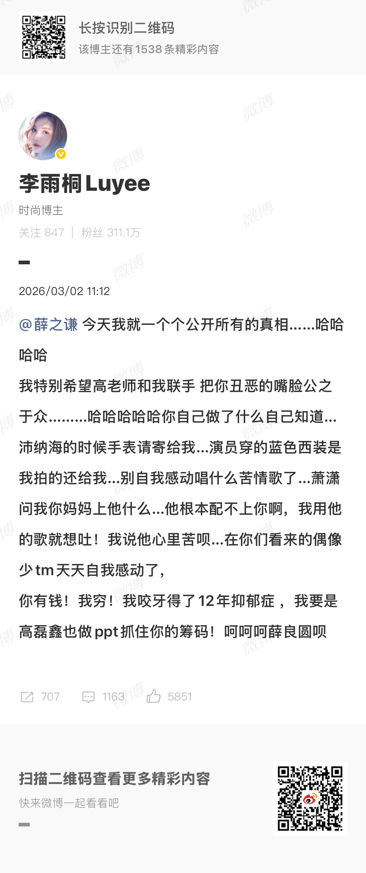 李雨桐喊话薛之谦李雨桐又微博喊话薛之谦:「今天我就一个个公开所有的真相……哈哈哈