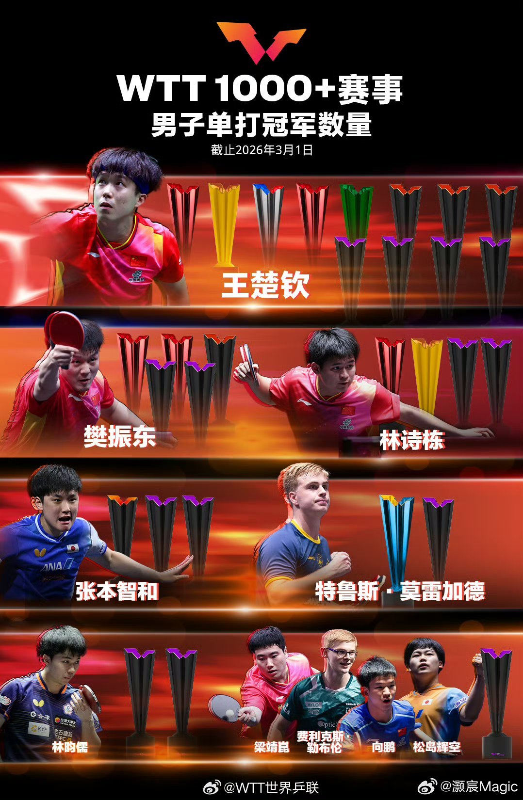 孙颖莎王楚钦领跑WTT冠军榜 WTT新加坡大满贯收官,孙颖莎、王楚钦包揽男女单打冠军,双双登顶WTT冠军榜。孙颖莎4-2逆转王曼昱,斩获第5座大满贯女单冠军,WTT1000+赛事冠军达13冠,积分11600分,连续190周世界第一,领先优势超2400分。王楚钦4-0横扫林昀儒,拿下第5个大满贯男单冠军,WTT1000+冠军9冠,积分11225分稳居男单榜首!!