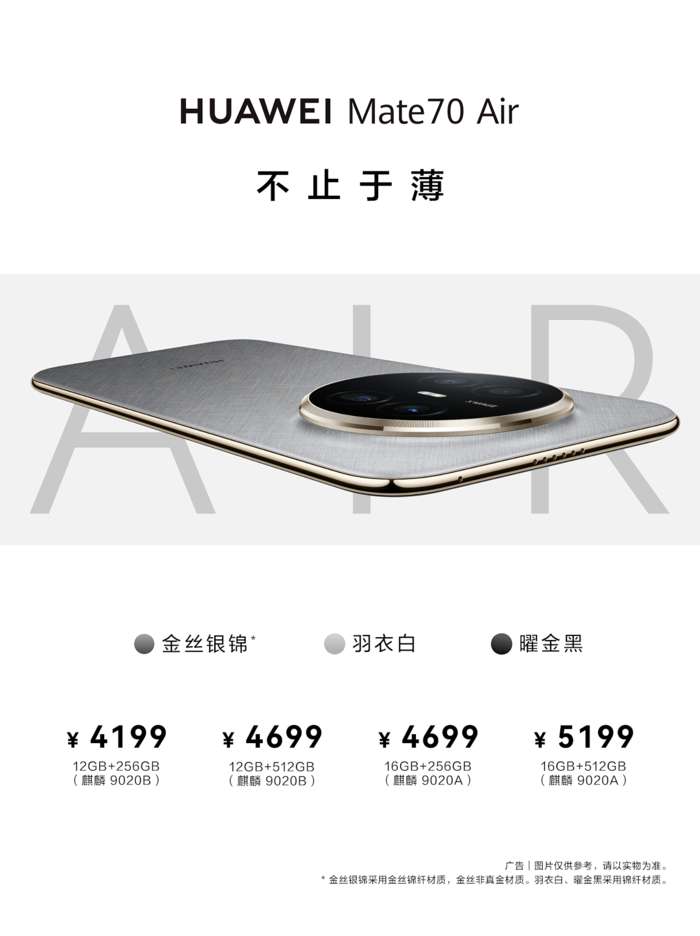 日前,华为官网正式上线开售了一款配备16GB运存的Mate 70 Air新机,从公布的信息显示,该机分别提供16GB+256GB和16GB+512GB存储组合两个版本,售价分别为4699元和5199元。值得一提的是,华为在官宣中罕见的直接标明了该机所搭载的处理器型号为麒麟9020A。而关注该机的小伙伴应该都还记得,该机于11月发售的时候搭载的是麒麟9020B处理器,定位轻薄旗舰,此次新增高配版更进一步丰富了产品线。
