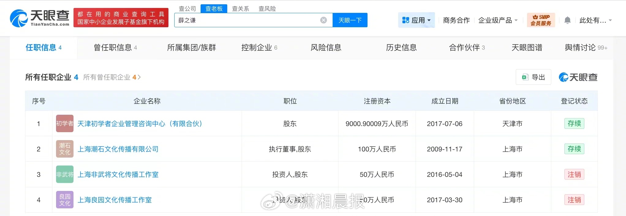 记者查询天眼查任职信息显示,薛之谦名下关联4家企业,其中2家为存续状态,包括天津初学者企业管理咨询中心(有限合伙)、上海潮石文化传播有限公司,此外,上海非武将文化传播工作室、上海良园文化传播工作室已被注销。值得一提的是,薛之谦与李雨桐(原名李璐褘)无直接商业关联。