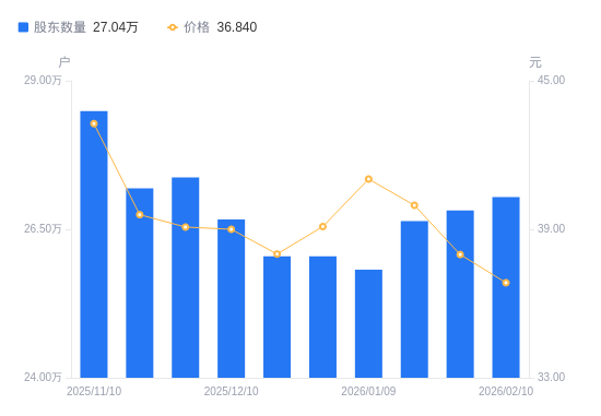 日期A股户数(户)流通A股户均持股数(股)户均持股市值(万元)2026-02-102704456419.7623.652026-01-302681686474.2724.592026-01-202663646518.1226.052026-01-092581776724.8127.592025-12-312604706665.6126.072025-12-192604706664.1625.322025-12-102666426509.9025.392025-11-282737186341.6124.792025-11-202718776384.5525.282025-11-102849156092.3926.36