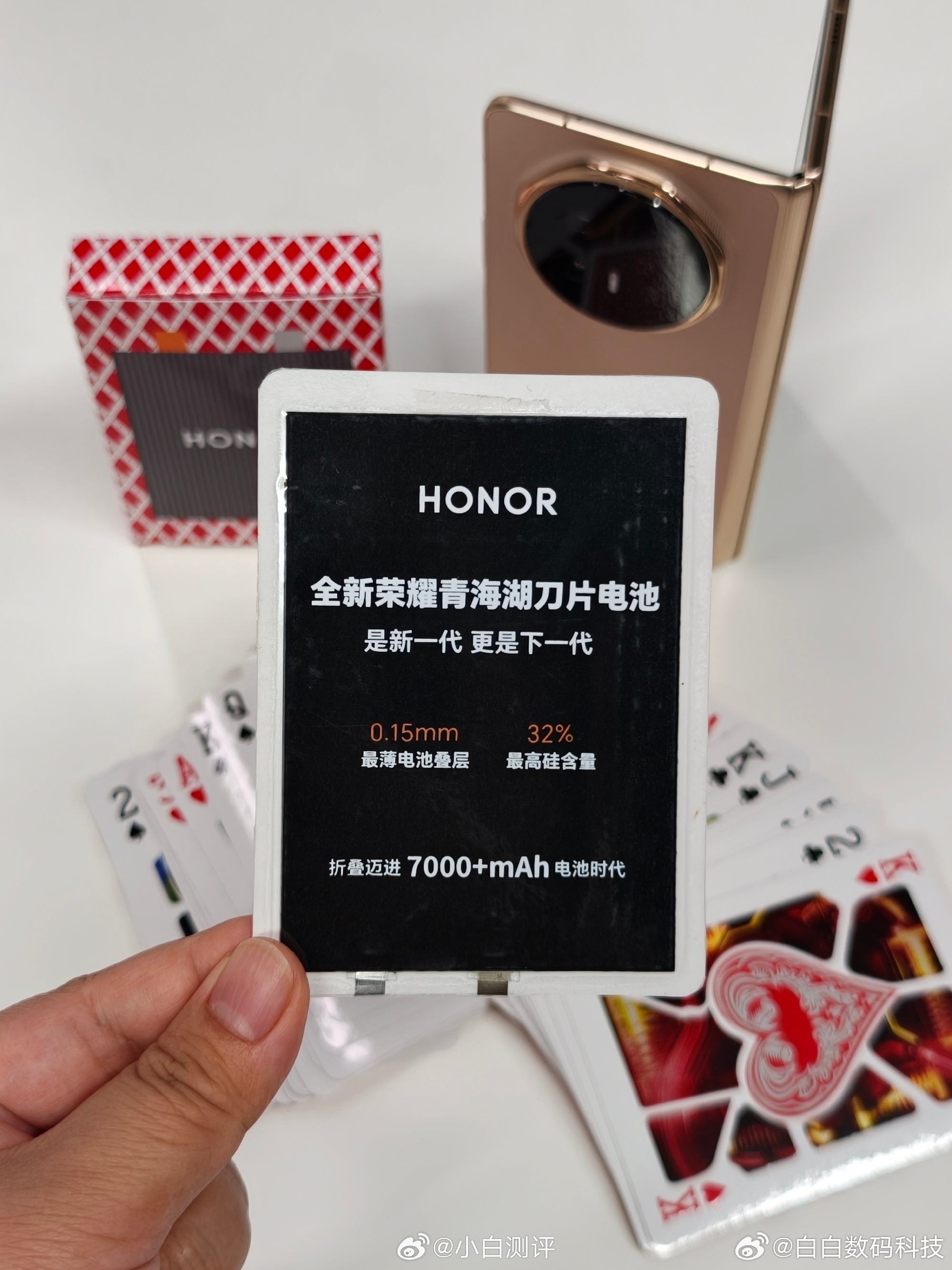 收到了荣耀Magic V6的邀请函,是副扑克牌,其中一张卡牌藏着荣耀的青海湖刀片电池,这次V6电池最大有7150mAh,比部分直板机电池还大,猛不猛