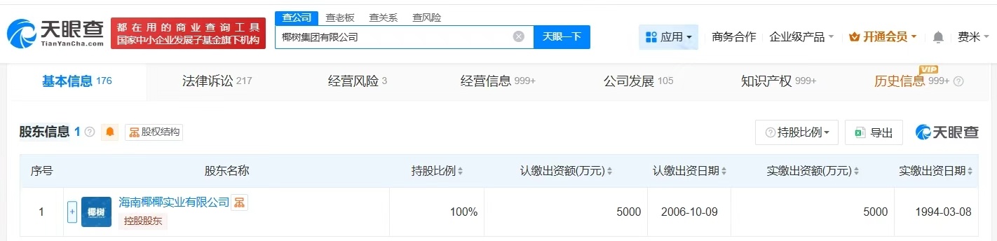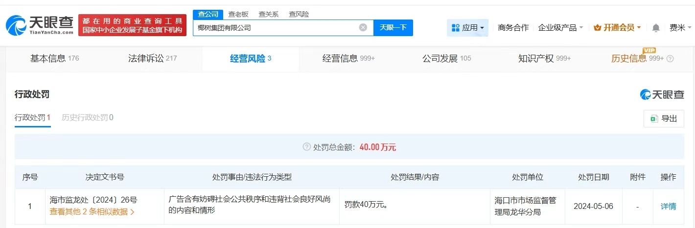 天眼查App显示,椰树集团有限公司成立于1980年7月,法定代表人为赵波,注册资本5000万人民币,经营范围包括食品、饮料的投资及管理,机械制造及维修,饮料技术咨询服务等。股东信息显示,该公司由海南椰椰实业有限公司全资持股。经营风险信息显示,2024年5月,该公司曾因广告含有妨碍社会公共秩序和违背社会良好风尚的内容和情形,被海口市市场监督管理局龙华分局罚款40万元。 海口市监局回应椰树低俗广告
