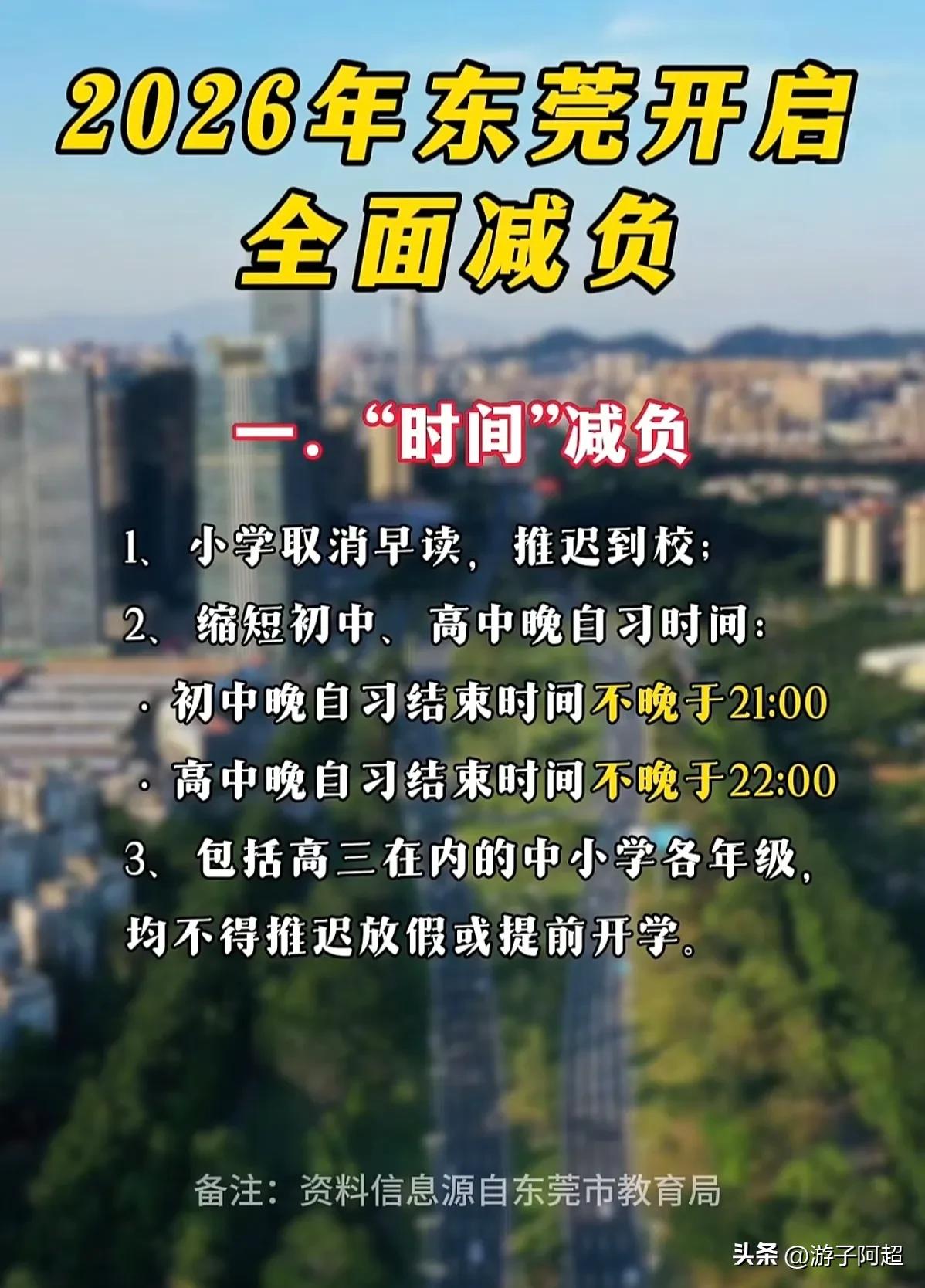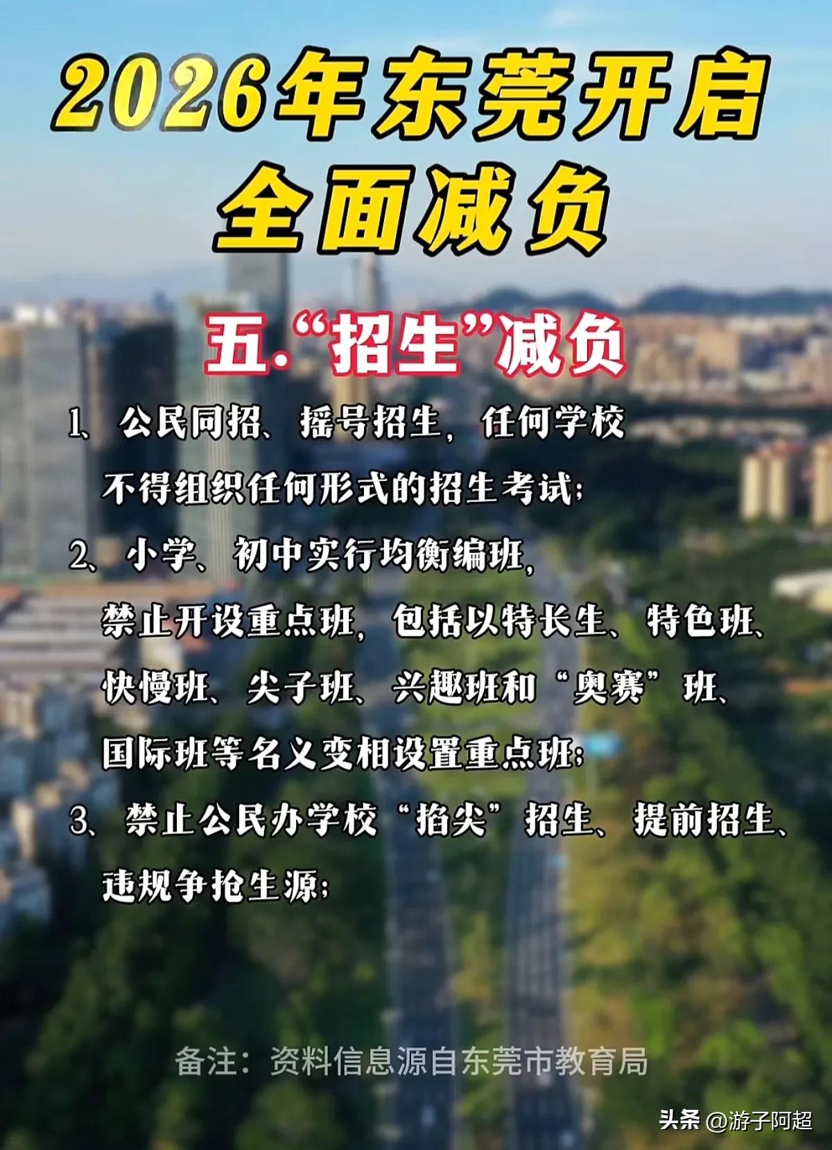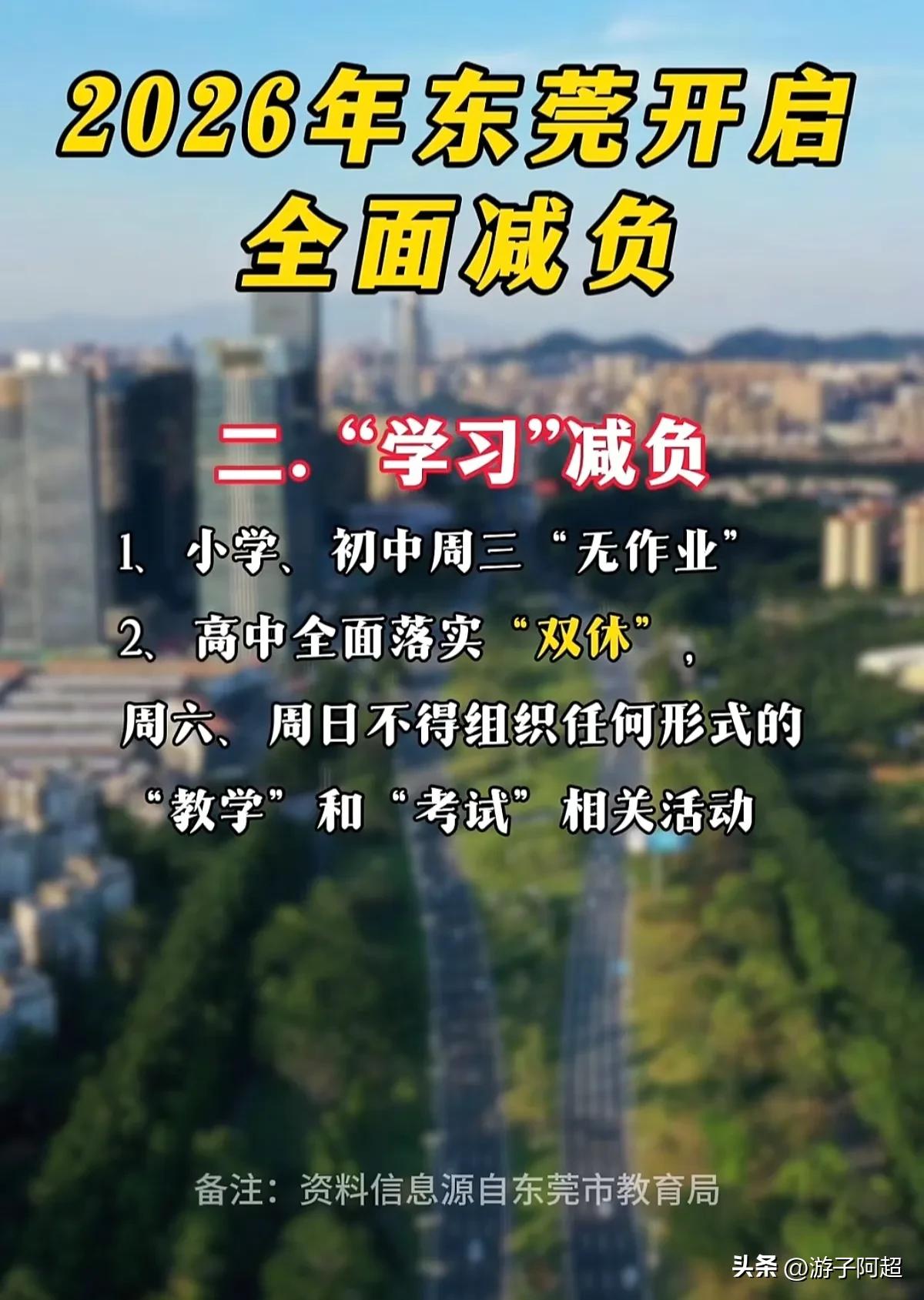 2026年春季开学前夕,东莞市开启全面教育减负时代。 东莞市教育局正式发布“阳光心育计划”,并配套实施一系列教育减负新政。围绕“时间管理”、“学业安排”、“考核机制”及“招生政策”等多个维度展开教育减负改革。 相关措施将于今年春季学期就在全市范围内全面铺开,确保政策落地生根、执行到位。此举旨在推动全市中小学生身心素质的均衡发展。 传统教育模式已难以适应现代教育需求,学生及家长群体可能需要一定时间来适应新的教育体系。