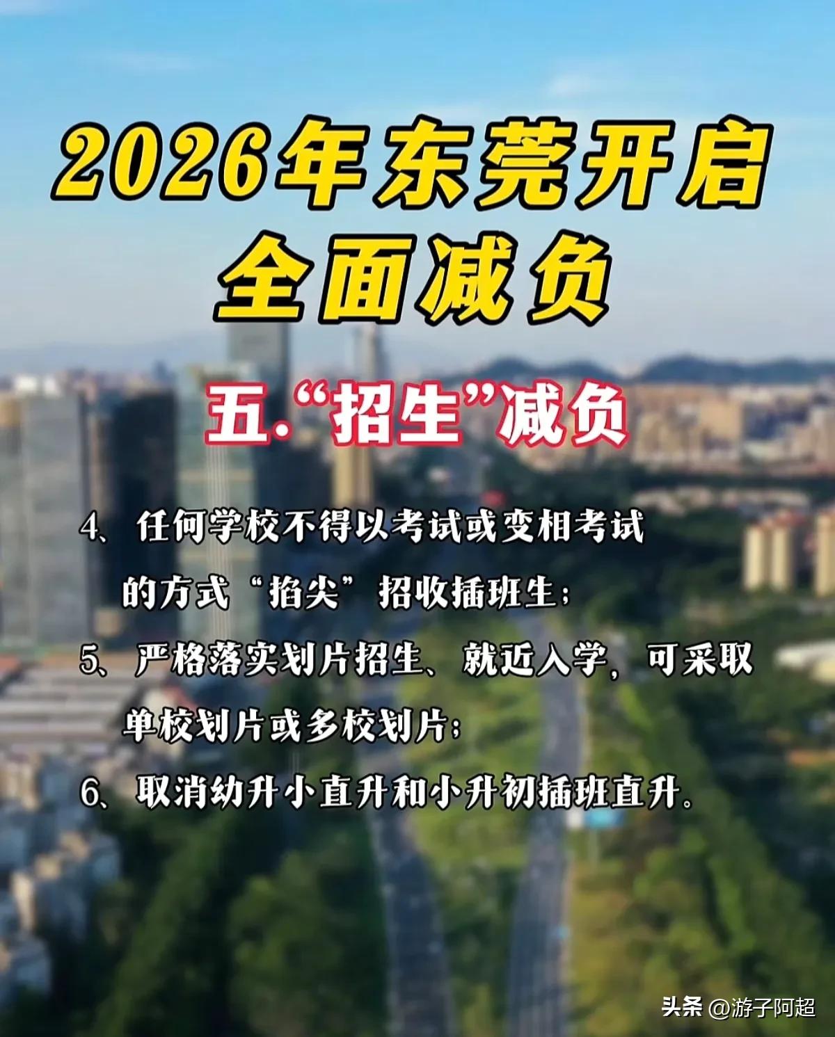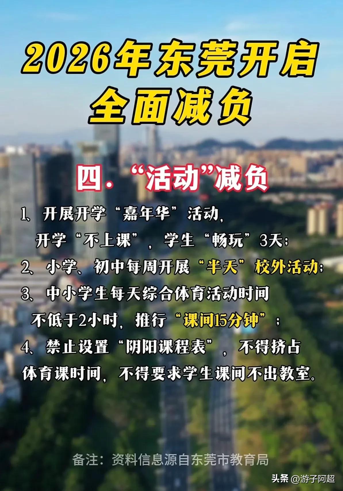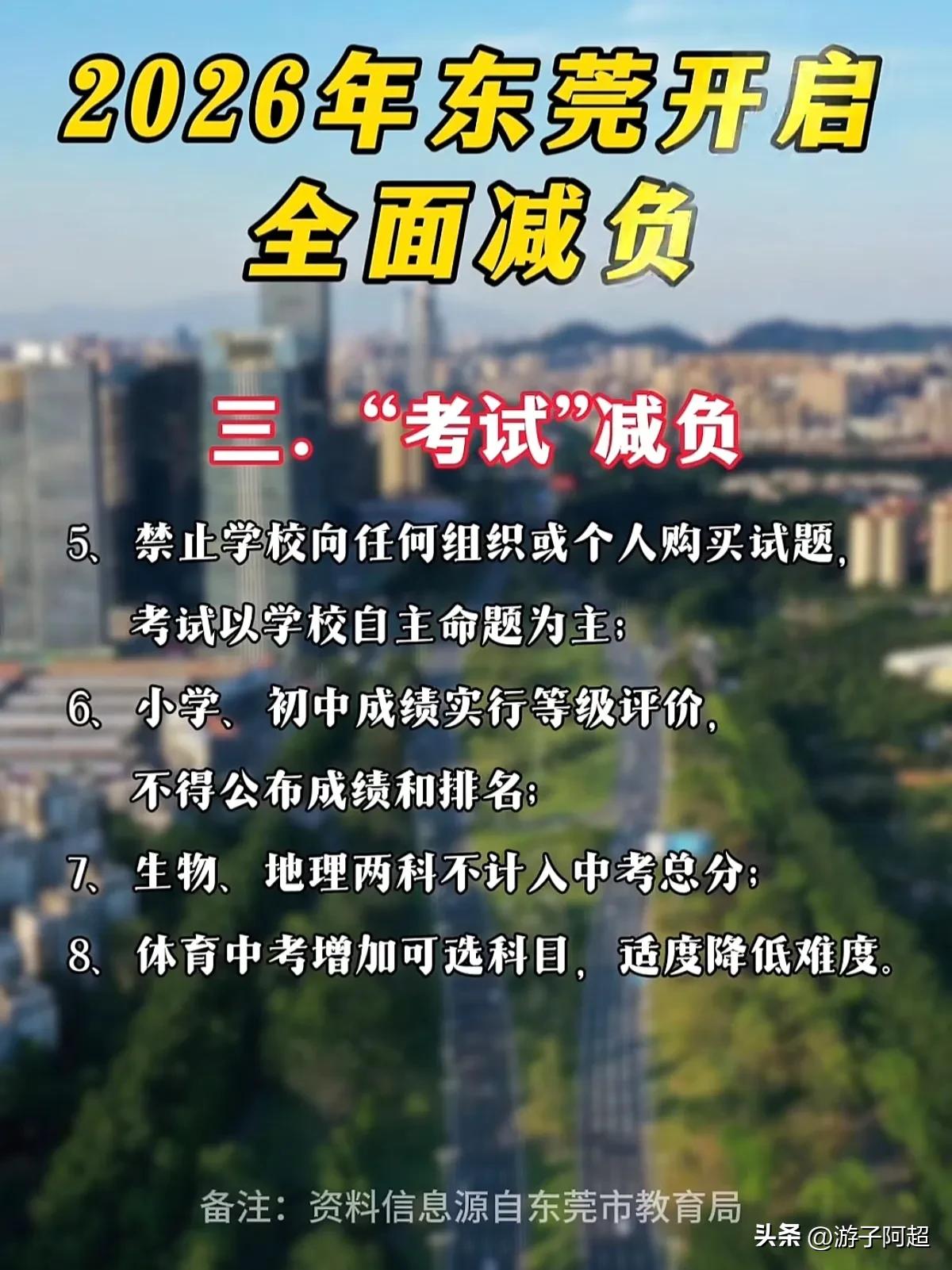2026年春季开学前夕,东莞市开启全面教育减负时代。 东莞市教育局正式发布“阳光心育计划”,并配套实施一系列教育减负新政。围绕“时间管理”、“学业安排”、“考核机制”及“招生政策”等多个维度展开教育减负改革。 相关措施将于今年春季学期就在全市范围内全面铺开,确保政策落地生根、执行到位。此举旨在推动全市中小学生身心素质的均衡发展。 传统教育模式已难以适应现代教育需求,学生及家长群体可能需要一定时间来适应新的教育体系。