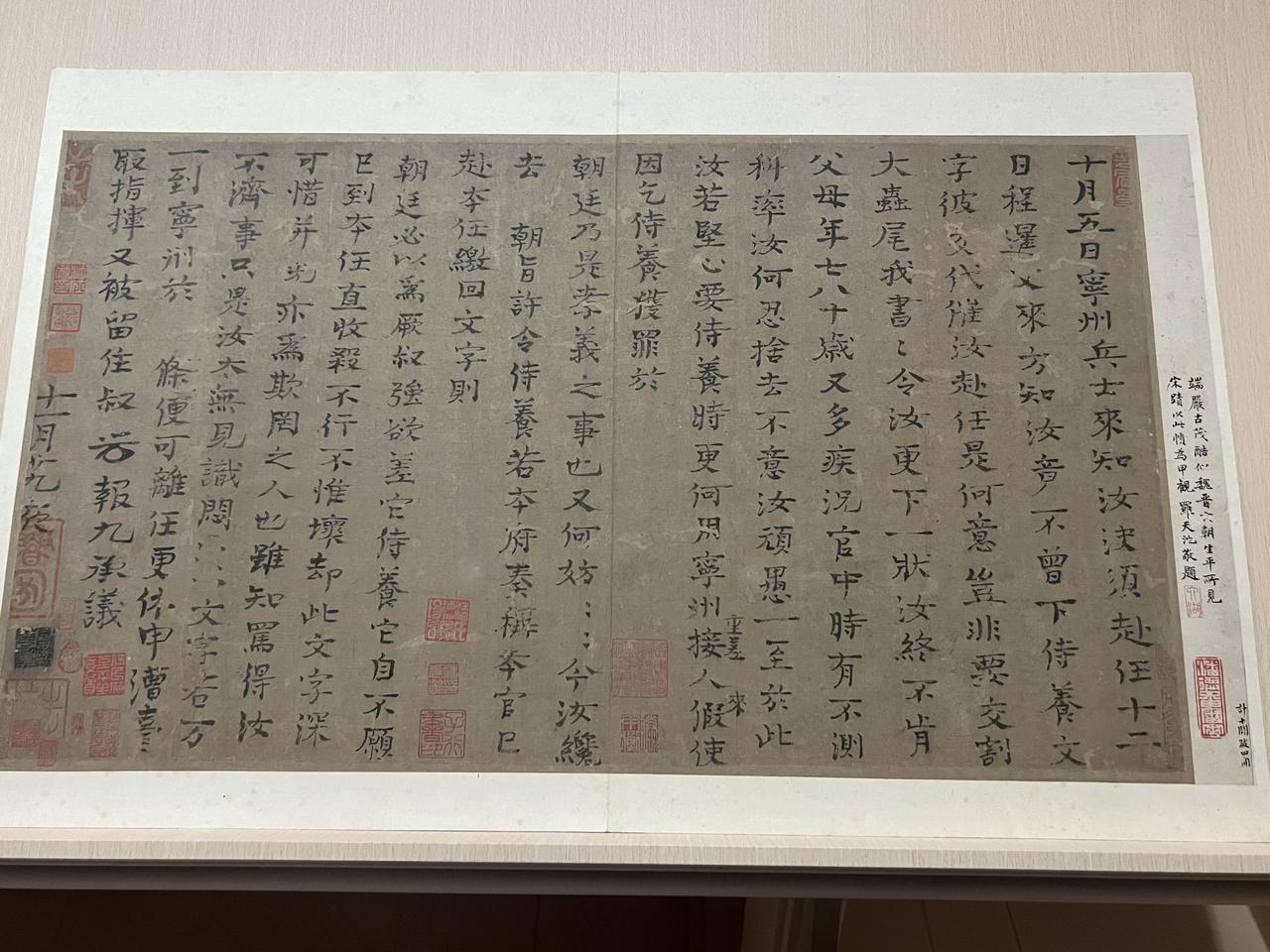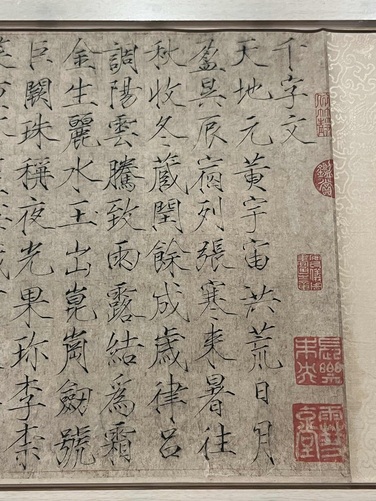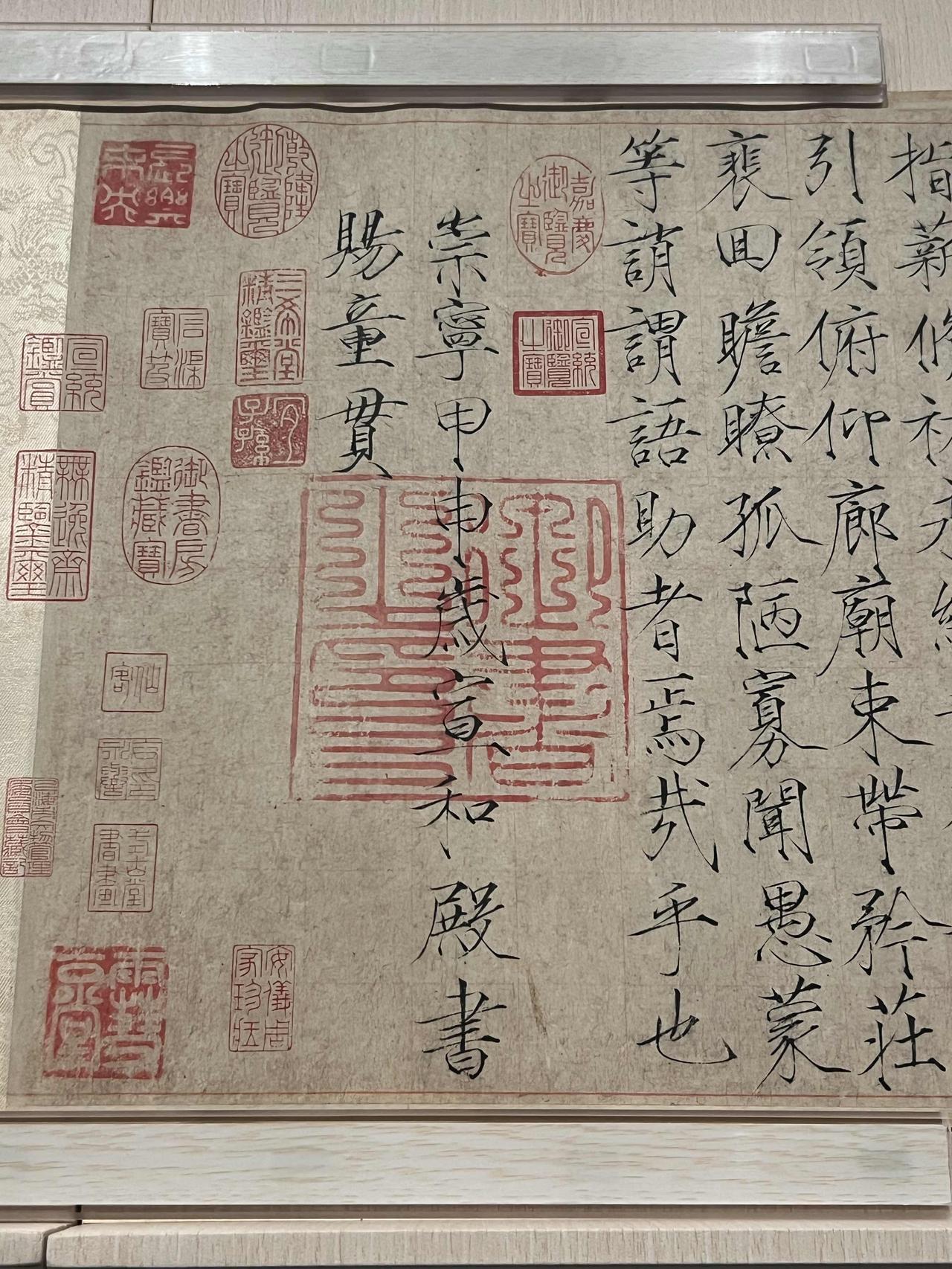 顶级文房重宝-宋徽宗瘦金体《千字文》 上海博物馆东馆的中国书法馆、绘画馆已经重新开放,这是新馆开馆后书画的第三轮更新,书法馆里迎来了本期重磅作品作品:艺术皇帝宋徽宗的瘦金体《千字文》。宋徽宗赵佶传世有两件《千字文》,其中瘦金体《千字文》收藏在上海博物馆,而狂草的《草书千字文》是辽宁省博物馆的镇馆之宝。 上海博物馆的瘦金体《千字文》落款:崇宁甲申岁宣和殿书赐童贯。这一年是崇宁三年(1104 年),当时宋徽宗23 岁,而在此之前的崇宁二年(1103),徽宗命王厚为主将、童贯为监军,西征吐蕃,收复河湟地区。次年灭亡吐蕃宗喀国,收复湟、鄯、廓三州,完成其父宋神宗“熙河开边”遗志 ,也是北宋晚期罕见的军事胜利,所以当时年轻的宋徽宗大喜,在宣和殿亲书此卷,以御笔书法赐童贯以表彰军功,这件顶级的文房重宝是极高的政治荣誉。 不过当时年过半百的童贯也还是有几分胆色,在担任监军大军来到湟州城时,皇宫里意外失火,宋徽宗觉得这是不祥之兆,便传下手谕撤军,童贯收下手谕看过后,一声不响地放到靴中。主将王厚问他徽宗手谕是说什么事,童贯面不改色地撒了一个谎,说:“陛下希望出兵成功。”于是,王厚、童贯率领大军继续前进,这才有了后面的胜利,这也是宋徽宗破格给他这样这么高荣誉的原因之一吧。