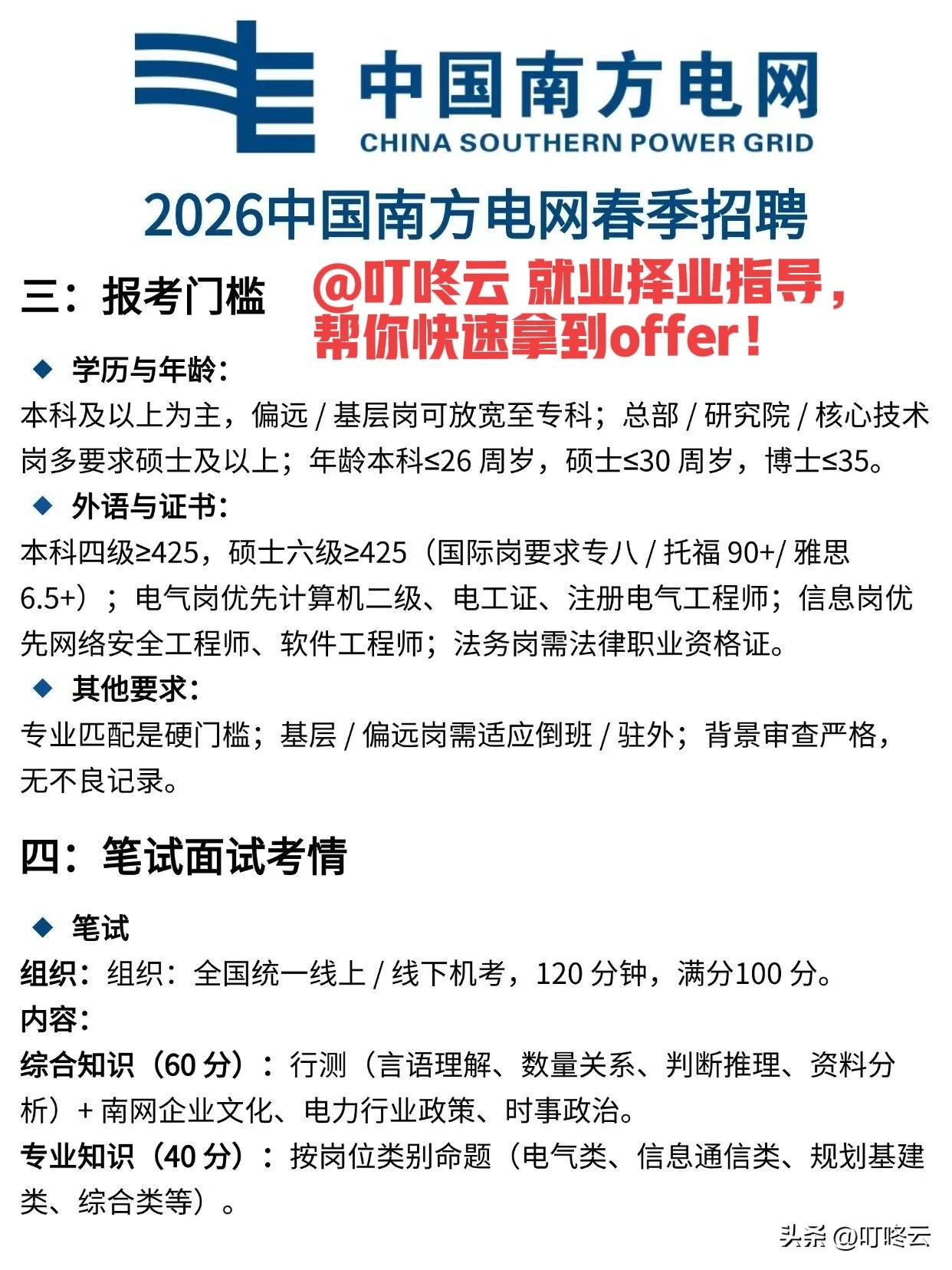 求职攻略一站搞齐!中国南方电网26年春招岗位要求及考试攻略全解析!快快抓紧时间收藏起来备用!一图读懂招聘要求,专业汇总,时间安排等等。不用东奔西跑,四处查询。@叮咚云 帮你一站准备齐全!速速围观揭秘详细内容!南方电网2026春招通关指南:从“网申小白”到“offer赢家”![来看我][来看我][强][强] 在“宇宙的尽头是编制”的时代,南方电网就是电力界的“顶流副本”。2026春招的号角已经吹响,想拿下这份“金饭碗”,就得像“打怪升级”,精准踩中每一个通关节点。[送自己一朵花][送自己一朵花] @叮咚云 帮你解读重点和职业指导:1.简历编写:精准卡位,拒绝无效内卷 专业匹配是“硬门槛”,电气工程、智能电网等工科是“顶流赛道”,大数据、AI算法等新工科是“潜力股”,会计学、法学等适配专业则是“百搭款”。简历要像“开盲盒”,把专业证书、实习经历、项目成果“焊”在显眼位置,电气岗优先突出计算机二级、电工证,信息岗亮出网络安全工程师认证,法务岗必须“焊死”法律职业资格证,让HR一眼就看到你的“硬核buff”。[强][强][福][福] 2.笔试面试:火力拉满,拒绝临场翻车 笔试是“全国统一机考副本”,120分钟内要搞定综合知识(60分)和专业知识(40分),行测、南网文化、电力政策一个都不能少。面试则是“终极boss战”,要像“戏精上身”,把专业知识、家国情怀、抗压能力“演”得淋漓尽致,基层岗要主动秀出“能倒班、能驻外”的硬核担当。[烟花][烟花][爆竹][爆竹] “宝剑锋从磨砺出,梅花香自苦寒来。” 春招不是“躺赢局”,而是“实力局”。精准卡位专业赛道,火力拉满笔试面试,你就能在“卷王遍地”的求职大军中“杀”出一条血路,解锁“毕业即巅峰”的人生剧本![招财进宝][招财进宝][锦鲤到来][锦鲤到来] 欢迎关注@叮咚云 将优先为粉丝职业规划指导,为你定制最适合的就业择业方案!欢迎留言交流讨论。[来看我][来看我] 免责声明:图片来自网络,仅供参考 央国企招聘 春招求职技巧 春招报名时间春招招聘国家电网求职