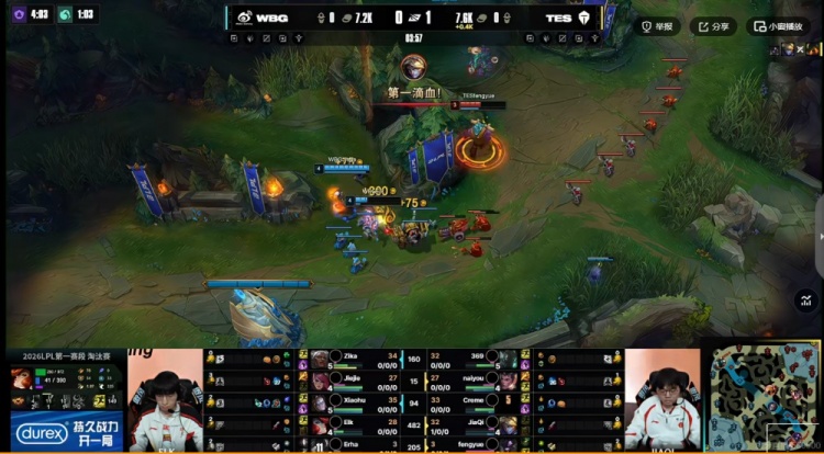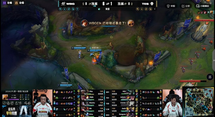 [18:33]WBG四人越下失败,但是回头逮捕了河道放先锋的naiyou赵信,不过同时JiaQi伊泽瑞尔找到机会,单切掉了Xiaohu的发条!双方又是一波1换1!