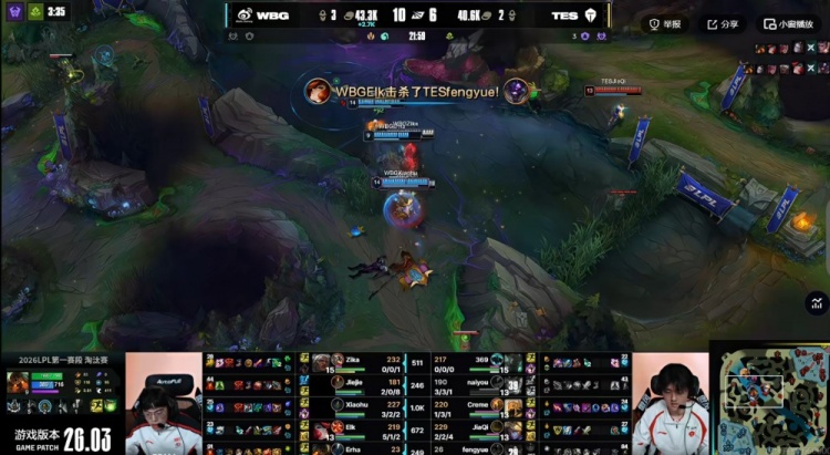 [30:07]野区遭遇,JiaQi伊泽瑞尔吃到三锁头根本走不掉,Elk女枪爽爽输出再拿三杀,全场KD来到13-2-7!WBG打出0换5团灭TES,结束首局比赛!