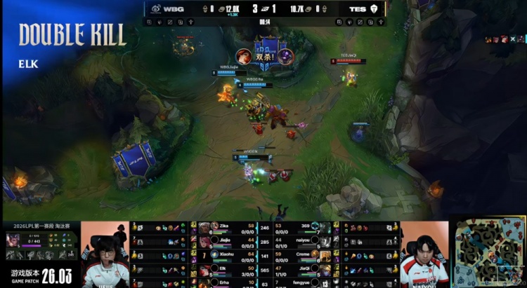 [14:12]WBG双人路+Jiejie蔚,中期再次强杀掉了Creme沙皇!TES则是三人越塔强杀Xiaohu发条!随后WBG再拿二小龙!本局炼金龙魂!TES换掉峡谷先锋!