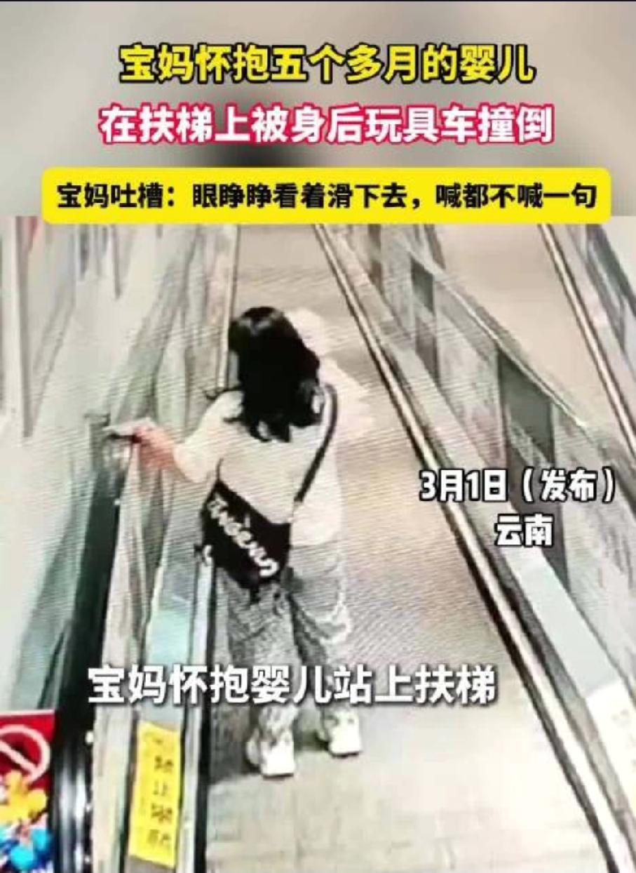 宝妈怀抱五个月大的婴儿在扶梯上遭遇意外,玩具车失控滑下导致孩子受伤,这一事件引发