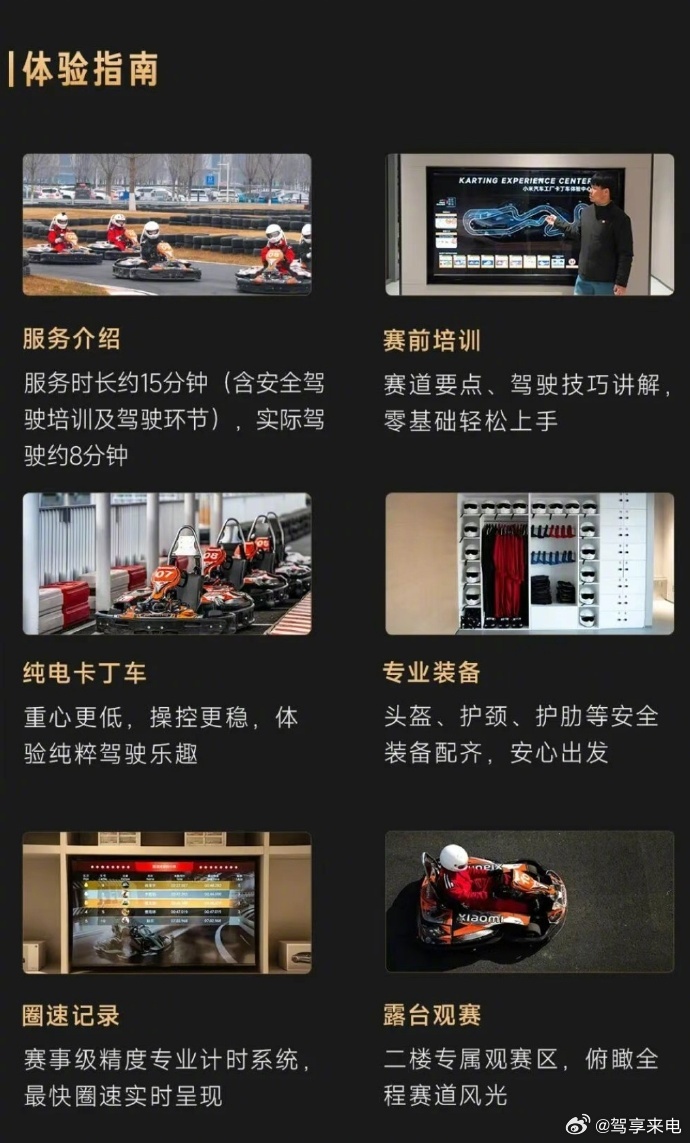 小米卡丁车体验中心营业小米又搞新花样!小米汽车工厂卡丁车体验中心正式营业,在北京亦庄超级工厂内,69 元就能解锁速度与激情,打工人、学生党都能冲🥳体验感直接拉满:580 米逆时针专业赛道,包含 13 个弯道,挑战性拉满;纯电双电机后驱,20 马力,极速 60km/h,重心低操控稳,零基础也能上手,还自带模拟运动声浪。价格超亲民,首发尝鲜价 69 元 / 人次,小米 App 积分可抵扣,还免费提供头盔、护颈等安全装备,额外支付少量保险和头套费,总花费不到百元。营业时间很灵活,工作日下班后、周末都能去,还能搭配参观小米汽车生产线、打卡小米食堂,一站式解锁工业旅游 + 卡丁车乐趣,赶紧约上朋友去打卡~
