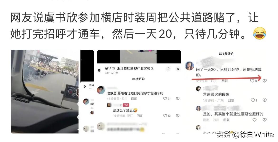 3月2日,虞书欣横店时装周这条路,每天封路费20,一个月600,4个月2400单位w 感觉这部剧拍下来都不够片酬的,她图什么?图维系热度的,我觉得大可不必如此,把一群人聚在一个地方,每天就看一面,是对自己时间的浪费,也是对她人时间的浪费,围观的人里面真的没有群演么? 就算为爱发电,也不可能一群人陪她待在横店四个月,只为每天见她一面吧……