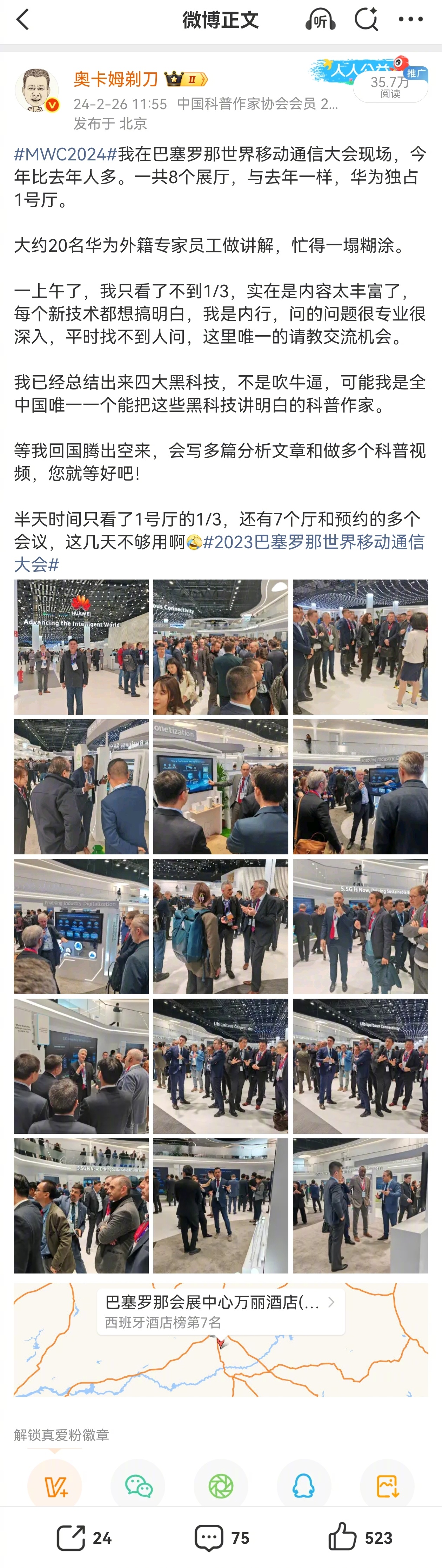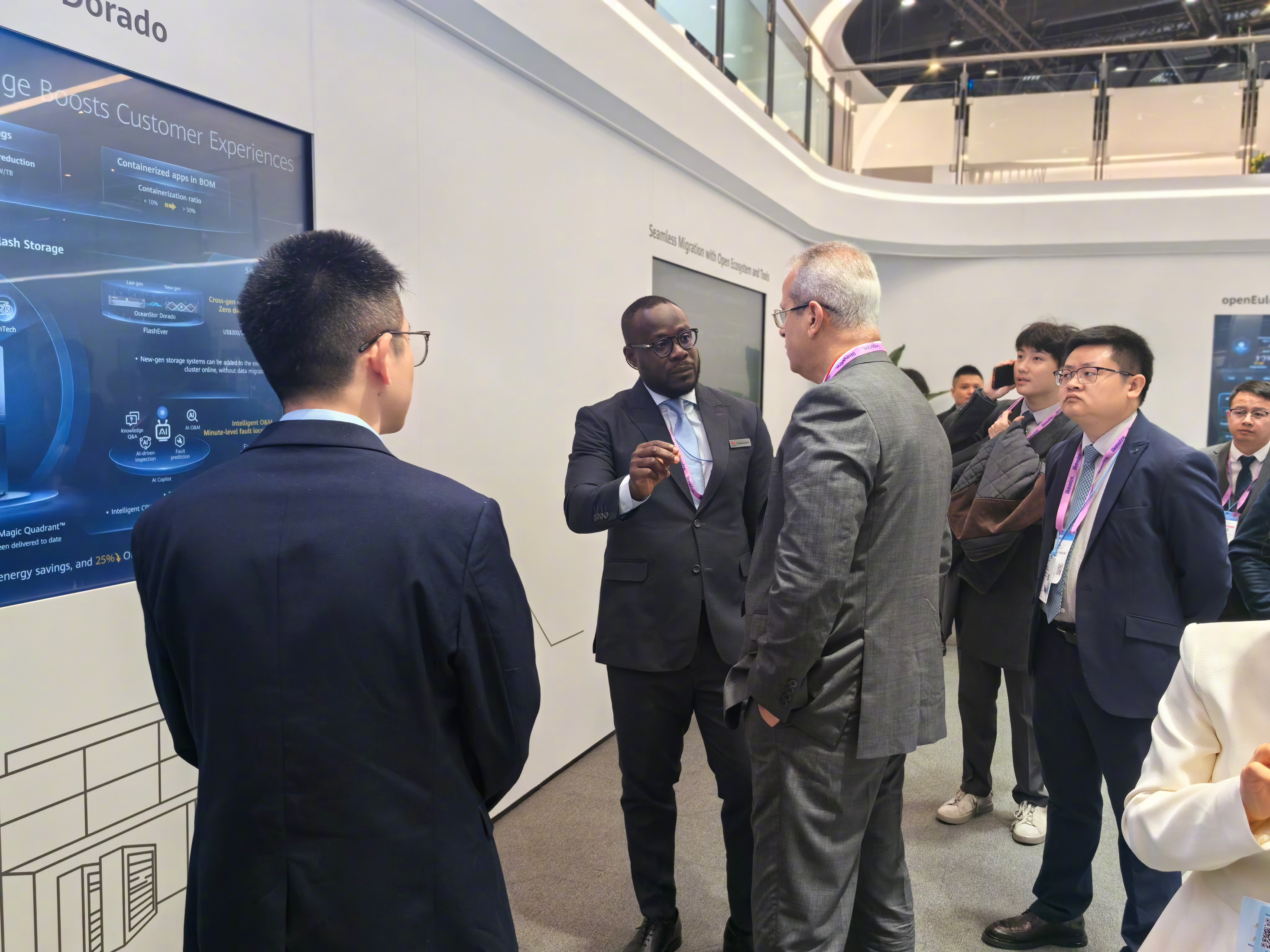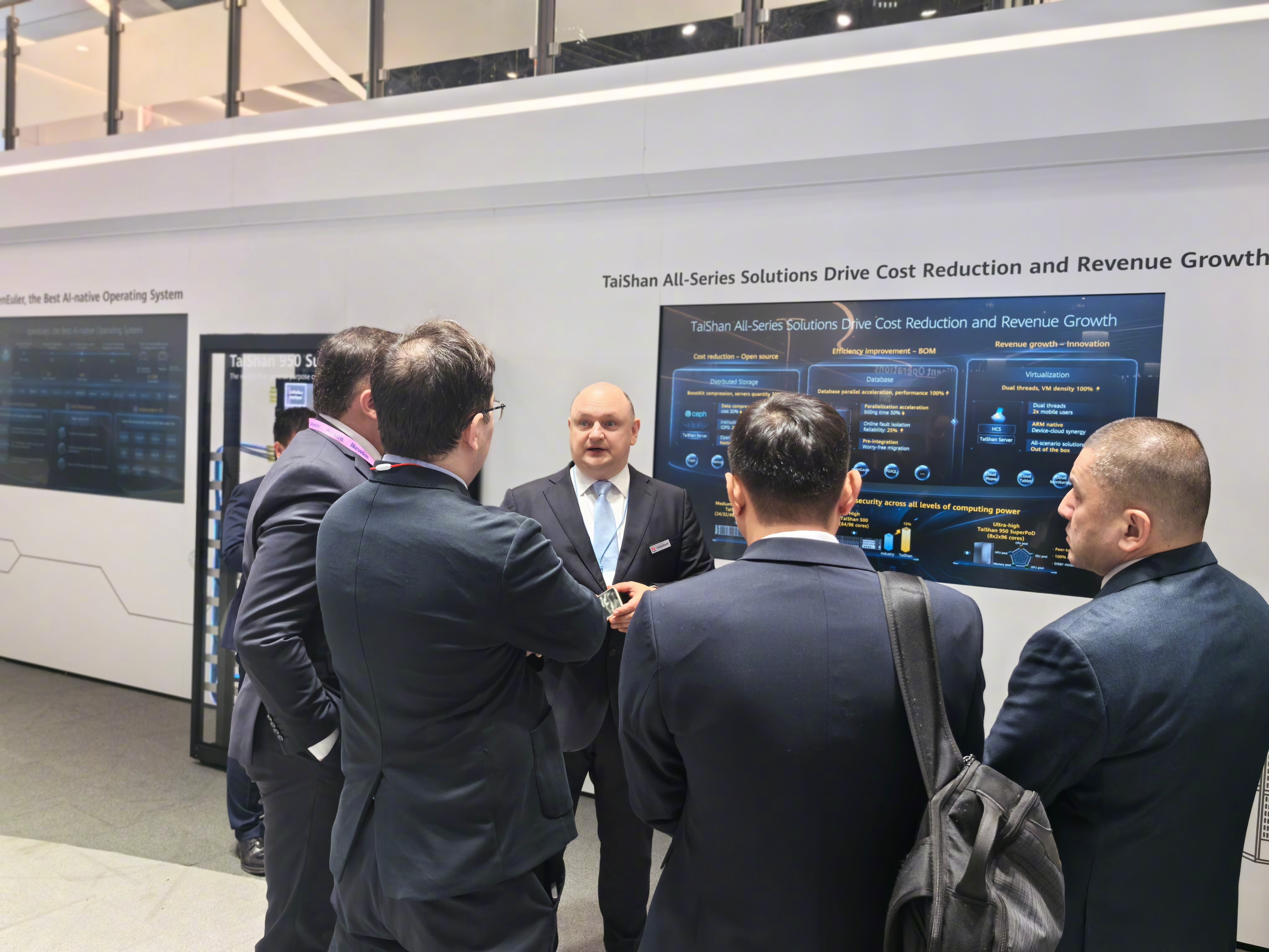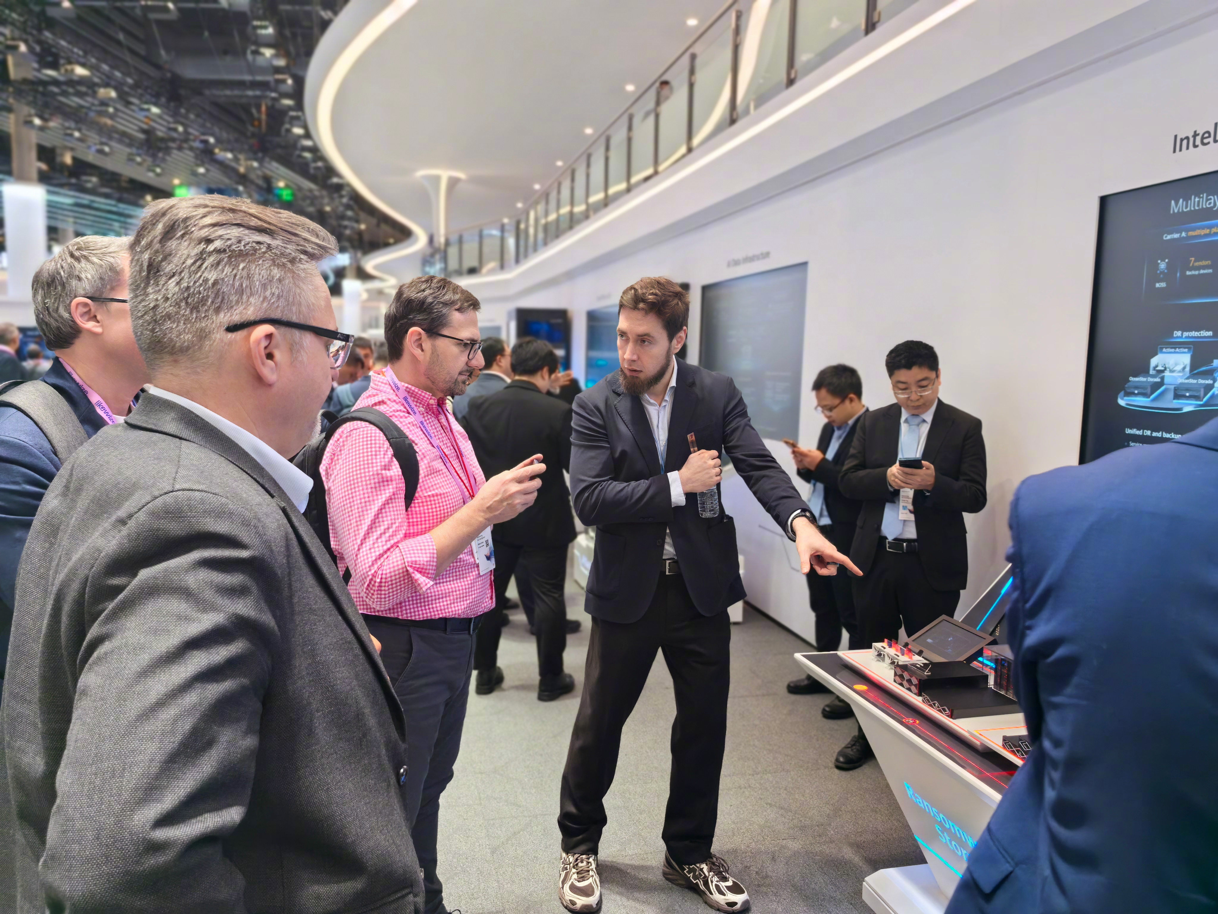 mwc2026 巴展观察,华为展厅每个展台基本都会有两个讲解员,一是中国员工,二是外籍员工,PPT也分中文和英文两个版本。例如图123左胸带华为牌的外籍员工。