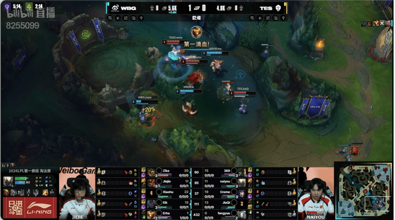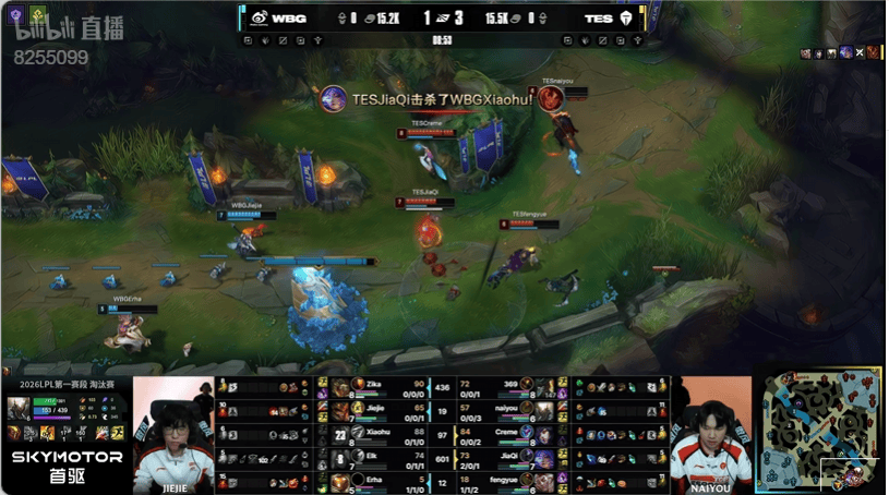 9分钟:TES进攻下路击杀ELK韦鲁斯,Xiaohu传送落地到人堆中也被收掉