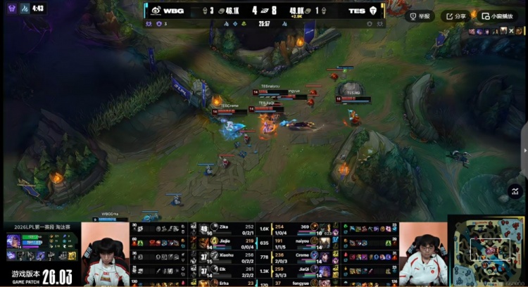 [25:41]龙魂团,正面naiyou潘森跳大进场吸引注意力,WBG想集火369船长结果阵型被拉扯!正面Creme阿狸绕到了配合队友解决掉了Xiaohu岩雀!WBG阵型完全被分割,TES拿下小龙+大龙!拿下局势主动权!