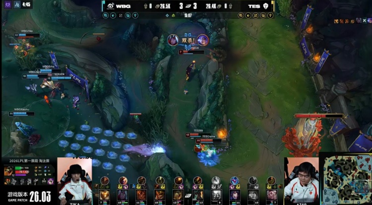 [14:53]小龙争夺战,Jiejie皇子再次抢到了小龙!Zika鳄鱼进场闪现W开转TES正面扛不住啊!最终是Elk维鲁斯双杀!WBG打出0换2!