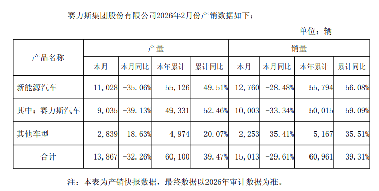赛力斯2026年2月份合计销量为15,013辆,同比下降29.61%;本年累计销量为60,961辆,同比增长39.31%。