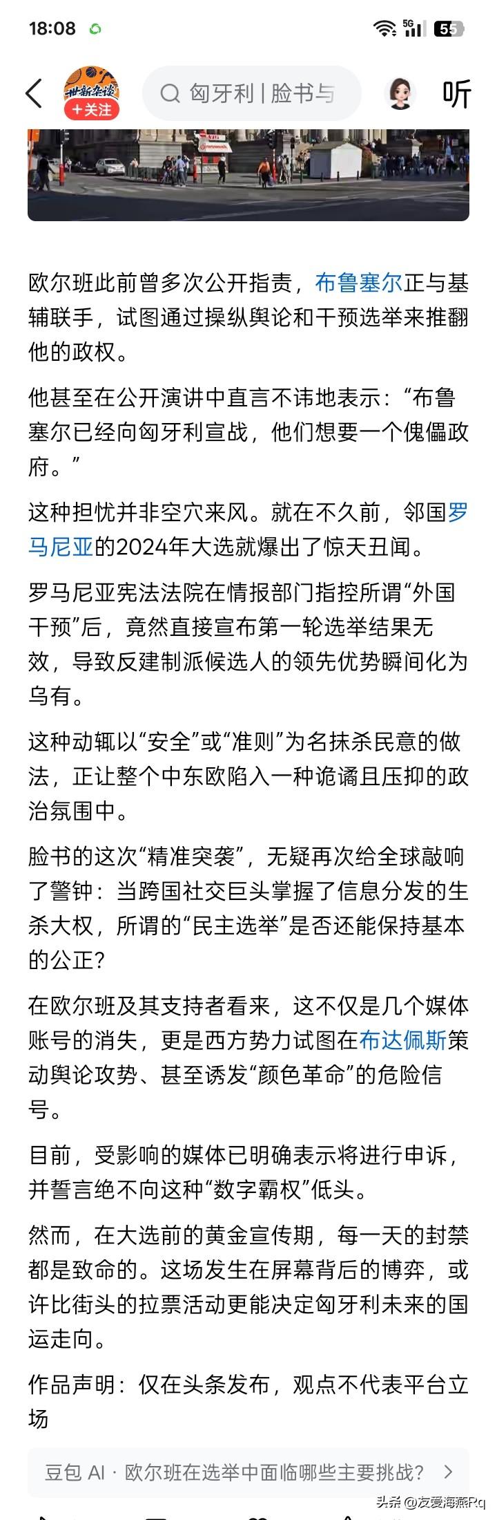 傻里巴机? 有消息说,社交巨头脸书近日突然之间封杀了匈牙利亲政府的媒体。匈牙利总理欧尔班此前,一直指责布鲁塞尔与乌克兰联手,打压他和他领导的匈牙利执政党青民盟。 其实,这就是秃子头上的蛳子——明摆着的事情。任何人或机构都要对自己不满意或看不上的人和组织进行打压,最多就是力度大小的问题,这根本就没有什么希罕。就是不指责,实际上也是这么回事。 现在已经进入3月份了,4月份的中旬匈牙利就要进行大选了,此时脸书、或者布鲁塞尔为什么打压欧尔班,估计大部分人都心知肚明,清清楚楚。 目前匈牙利大选前的民调显示,欧尔班领导的执政党青民盟远远落后于反对党“蒂萨党”。 谁厉害,在选民直接选举国家领导人的情况下,选民最厉害。