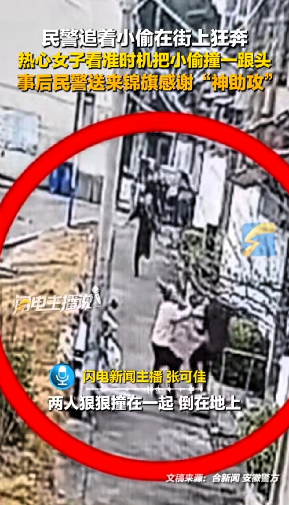 民警追着小偷在街上狂奔,热心女子看准时机把小偷撞一跟头,事后民警送来锦旗感谢。 这热心女子太飒了!民警追着小偷在街上狂奔,那场面紧张刺激。 小偷估计心里正想着怎么逃脱呢,哪料到半路杀出个“程咬金”。这女子看准时机,直接把小偷撞了个跟头,给民警帮了大忙。 视频里女子看到几名民警正在奋力的追赶小偷,眼看小偷就要跑过去,女子瞅准时机用力撞过去,女子被小偷撞倒在地,随后小偷也摔倒在地,就在这一瞬间民警赶紧按着小偷。 不得不说女子真是又勇敢又智慧,普通女性看到这一幕多数反应都是目瞪口呆,根本弄不清发生了什么事?即使知道事情的原委,面对歹人也不敢随意出手, 而女子不但反应迅速,更出手及时,关键时刻帮了民警的忙。 事后民警给女子送锦旗,表扬女子勇气可嘉,神助攻。 看到这一幕想到一句话“谁说女子不如男”只是未到紧要时。 这种见义勇为的行为太值得点赞了。就像之前内蒙古包头那个休假武警杜彦海,5秒就制服小偷。这女子和武警一样,在关键时刻勇敢出手。 事后民警送来锦旗感谢,实至名归。生活中有这样的热心人,社会都更有安全感啦!