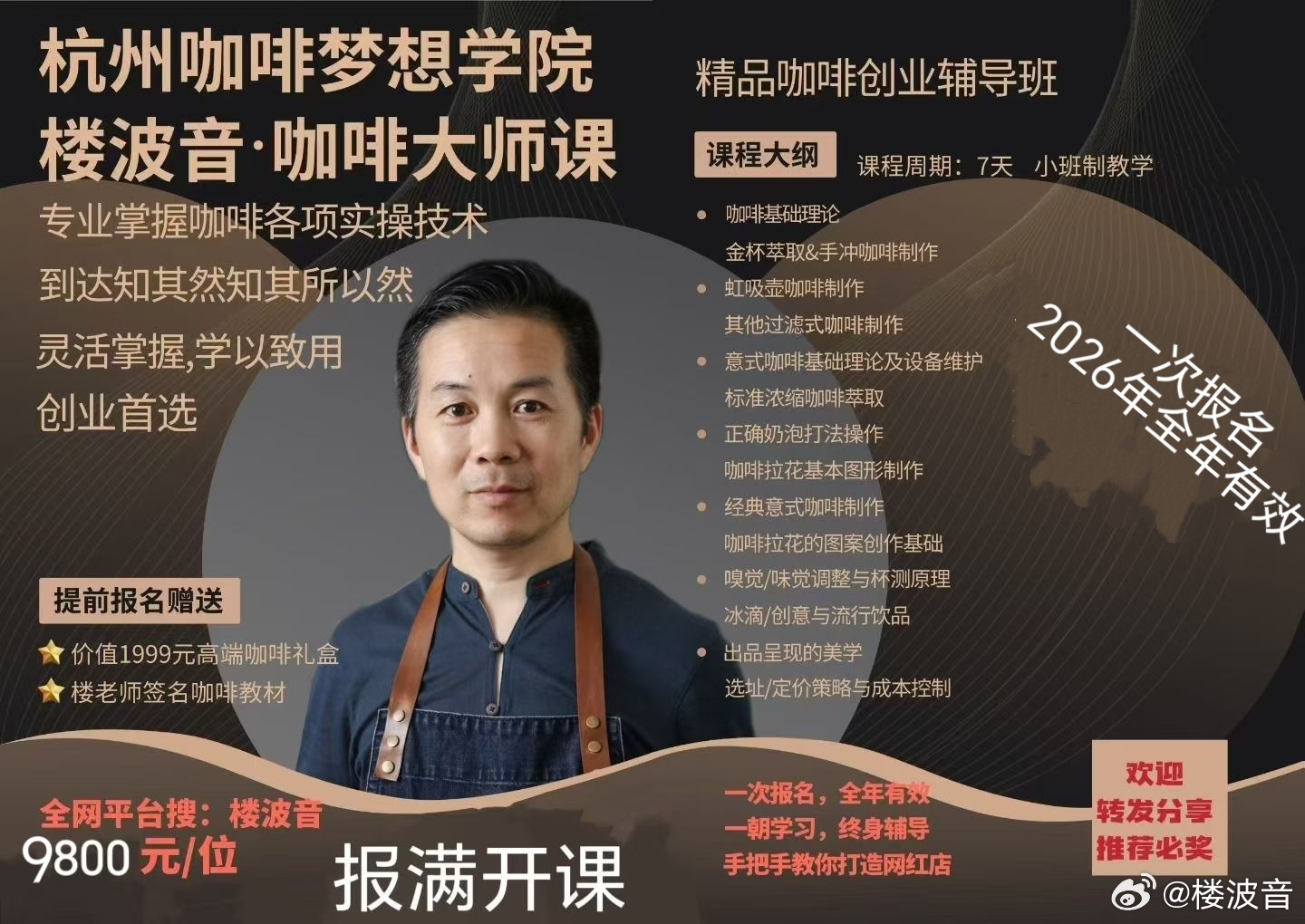 上课时间:3月21~27日上课地点:诗瓦娜咖啡烘焙工厂店内容优势:开店成本控制,实体门店流量落地实操,产品结构优化与定位