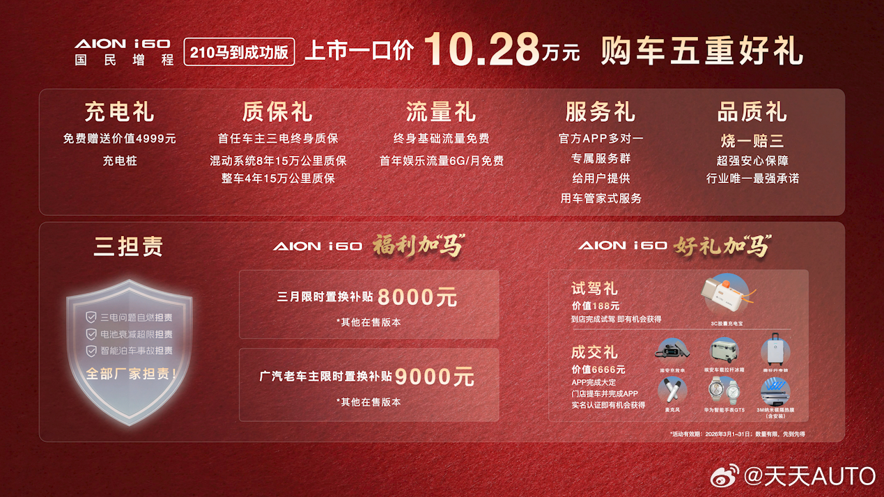 埃安i60马到成功版的推出,把这一逻辑推向了极致。10.28万的售价,配上210km纯电续航、1240km综合续航、3C快充、五连杆后悬、弹匣电池......这些两年前还是20万级“豪华套餐”的配置,如今被埃安做成了国民标配。而埃安i60其他在售版本,也同步加码了权益,3月份限时置换补贴8000元,广汽老车主更是高达9000元,诚意十足。