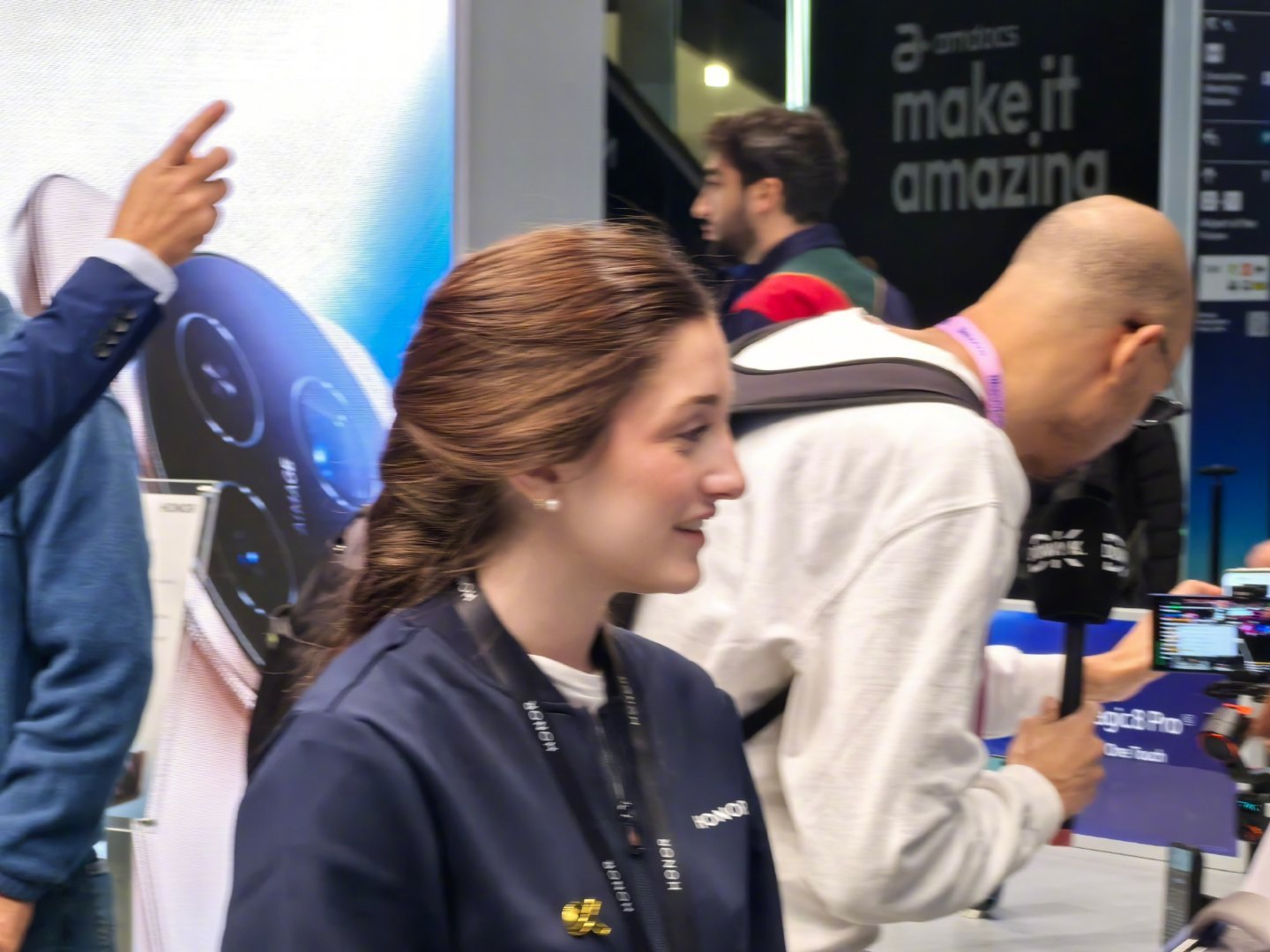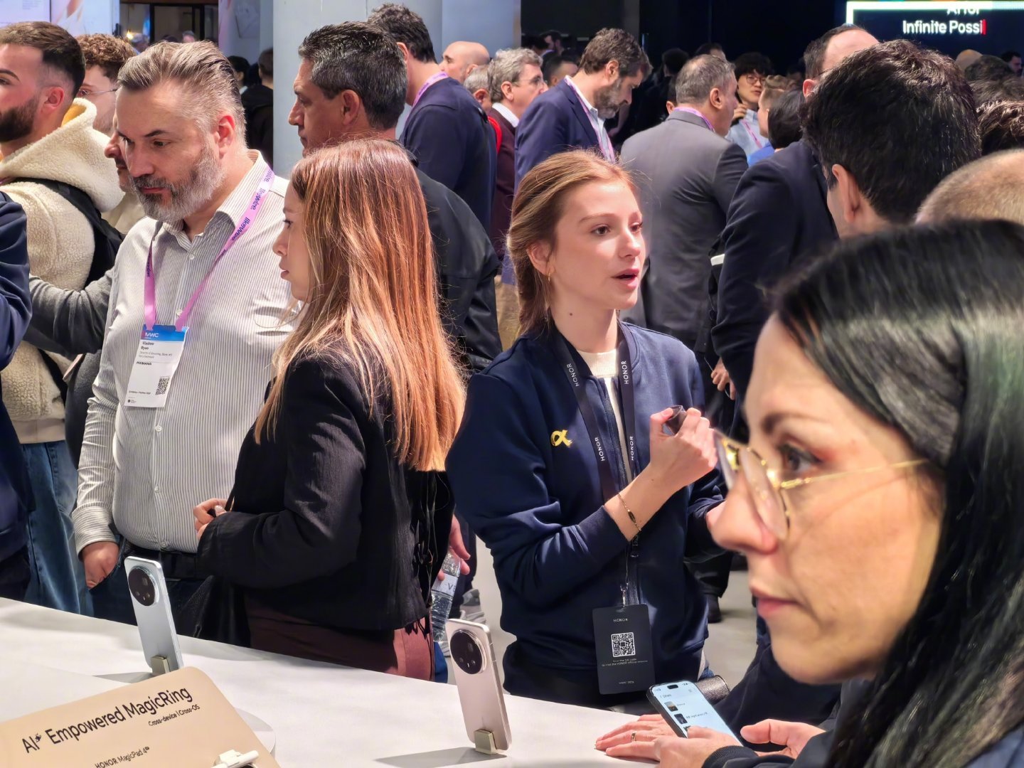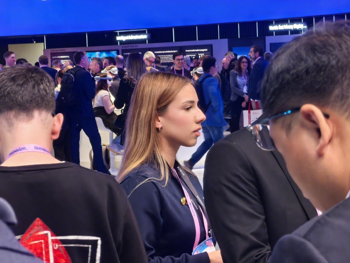 mwc2026 跟华为展厅的男性技术专家讲解员不同,展厅是一色的外籍年轻披肩发美