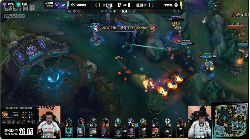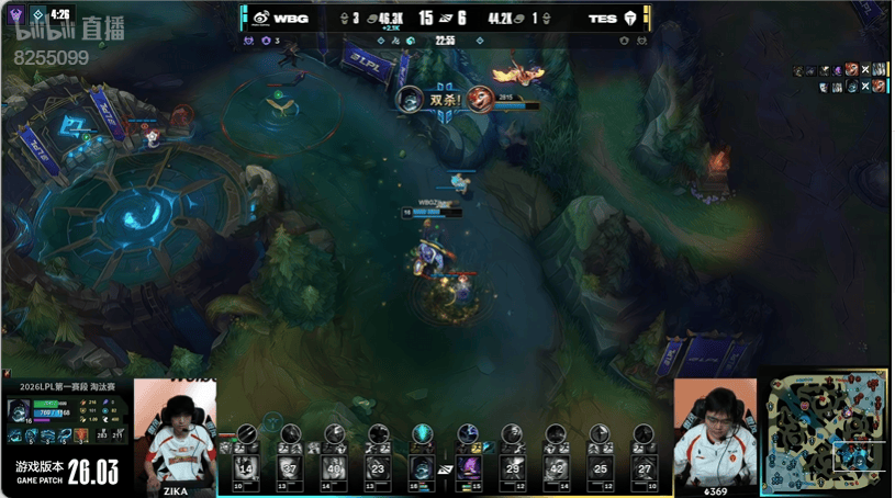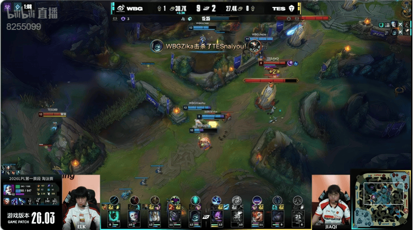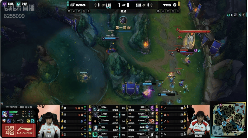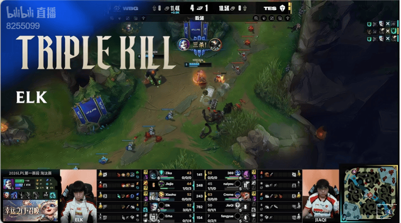5分钟:双方下野辅对拼JiaQi站位靠前吃到太多伤害,ELK金克丝拿下三杀