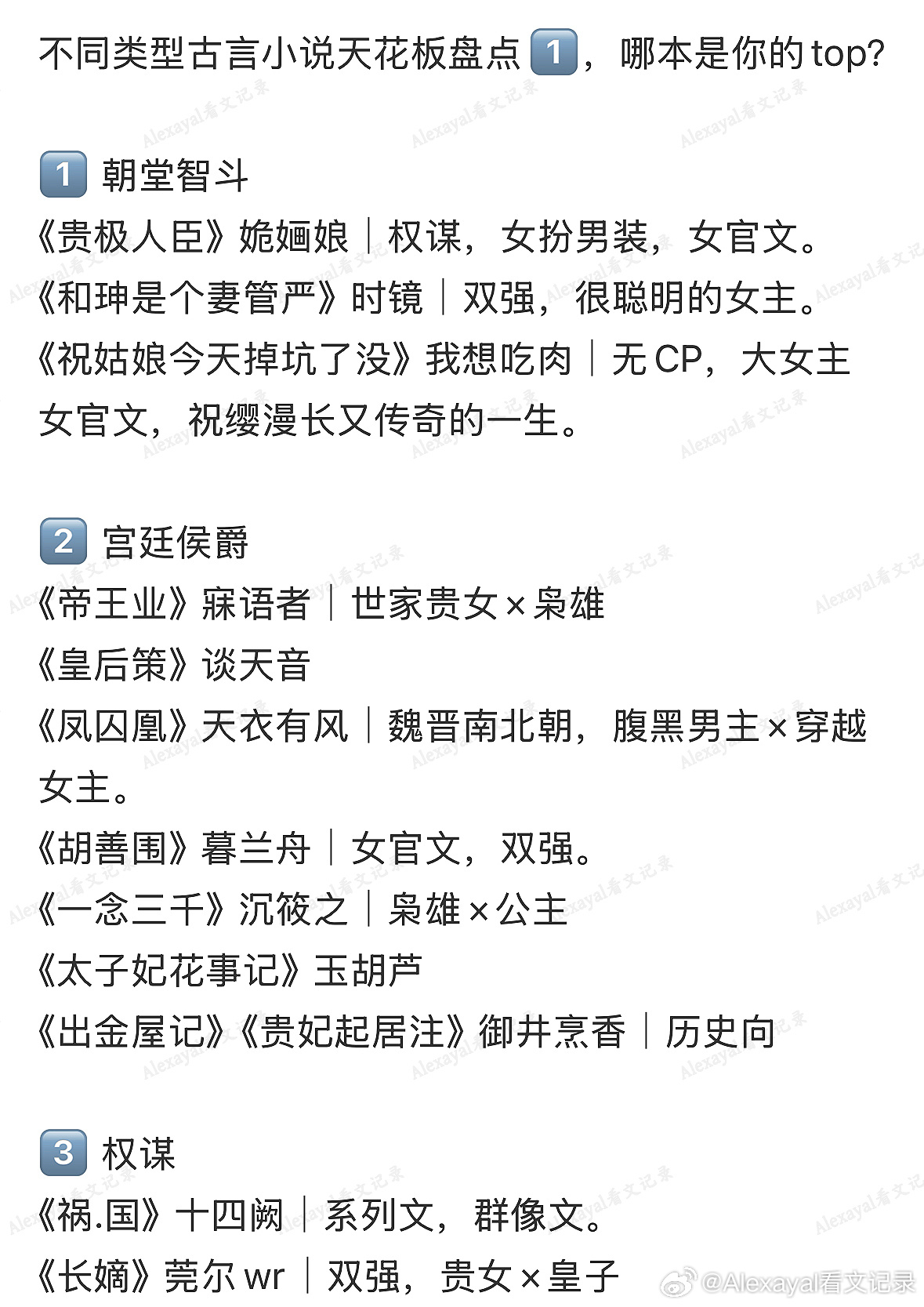 不同类型古言小说天花板盘点1️⃣,哪本是你的top?1️⃣ 朝堂智斗《贵极人臣》姽婳娘|权谋,女扮男装,女官文。《和珅是个妻管严》时镜|双强,很聪明的女主。《祝姑娘今天掉坑了没》我想吃肉|无CP,大女主女官文,祝缨漫长又传奇的一生。2️⃣ 宫廷侯爵《帝王业》寐语者|世家贵女×枭雄《皇后策》谈天音《凤囚凰》天衣有风|魏晋南北朝,腹黑男主×穿越女主。《胡善围》暮兰舟|女官文,双强。《一念三千》沉筱之|枭雄×公主《太子妃花事记》玉胡芦《出金屋记》《贵妃起居注》御井烹香|历史向3️⃣ 权谋《祸.国》十四阙|系列文,群像文。《长嫡》莞尔wr|双强,贵女×皇子《凰权》天下归元|女扮男装,大女主文。《四合如意》云霓|重生《恰逢雨连天》沉筱之《他从雪中来》过期白开水|温柔型古言《三十六陂春水》衣冉|先婚后爱,相爱相🔪。4️⃣ 江湖/武侠《有匪》priest|我最喜欢的一本大女主武侠《刺.客》沈雁|短篇《解甲》《秘方》八条看雪《一寸相思》紫微流年|作者文笔很好!《君子怀璧》木沐梓|双强《镜明花作》Twentine5️⃣ 宅斗文《世婚》《良婿》意千重|有缺点的普通人的故事。《嫡谋》面北眉南|双强《九重紫》《金陵春》《庶女攻略》吱吱《兰香缘》禾晏山|强取豪夺《良陈美锦》沉香灰烬|年龄差《重生明珠》七和香|先婚后爱《嫡策》董无渊《庶女生存手册》御井烹香6️⃣ 枭雄男主《成欢》崔梅梓《慕南枝》吱吱|枭雄×群主,女主掌权。《沉香如血》瓶子阿|架空三国,女主二婚,《楚襄有梦》未晏斋《北朝纪事》绿梅枇杷|南北朝,枭雄×公主,我的古言top之一。《悬舍》《写娘子》闫灵|相爱相🔪,权谋。7️⃣ 大女主成长《姜姬》多木木多|从一无所有到掌权的女帝文《第一侯》希行|重生,女帝。《千山记》石头与水|大女主权谋文。《逢晴日》非10|重生《早安!三国打工人》《穿越成宋徽宗公主》蒿里茫茫|穿越8️⃣ 种田/市井生活《吉祥如意》暮兰舟|小人物的故事《农家小福女》郁雨竹《长安小饭馆》樱桃糕《汴京小面馆》《在国子监开小卖部》松雪酥《守陵娘子山食纪》绿豆红汤9️⃣ 双强《乘鸾》《藏珠》云芨|很流畅~男强女更强。《似锦》冬天的柳叶|重生,贵女×皇子《清沅》崔罗什|重生,贵女×皇子,外传很带感!《踏枝》玖拾陆《折锦春》姚霁珊|架空三国两晋,女主重生,悬疑+宅斗+权谋《诸事皆.宜百无禁.忌》木沐梓《灯花笑》《重生之将门毒后》千山茶客🔟 穿越/穿书《我妻薄情》青青绿萝裙|女官,医女文。《清穿日常》多木木多《月明千里》罗青梅《看碧成朱》江薇|双强《渡阳.气》风歌且行|阴湿男主《娇贵s了》不得无趣|很罗曼蒂克的一本《玉堂金阙》《权臣的掌珠》看泉听风|爽文《探花郎的极品二嫂》绿豆红汤|女官,武皇时期!《男主他老是那样绝情》漠小兰《浮生小记》金波滟滟1️⃣1️⃣ 相爱相🔪《巧逞窈窕》绣猫|枭雄×公主《七星彩》明月珰|极限拉扯,很聪明、漂亮,坚韧的女主。《门阀之上》诗槊|正剧向的权谋文,事业心大女主,架空南北朝。《关山南北》锦绣灰|架空南宋,武侠正剧。《皇弟》则慕《我同夫君琴瑟和鸣》秋风外|先婚后爱,江湖。1️⃣2️⃣ 先婚后爱《表妹万福》蓬莱客|女主重生,温柔型男主。《他定有过人之处》天如玉《秀才娶了兵》梁芳庭《青云台》沉筱之《逆兰》溪畔茶《白雪歌》雾圆《骄婿》果木子《嫤语书年》海青拿天鹅1️⃣3️⃣ 悬疑/探案《攻玉》凝陇|少男少女《大唐辟珠记》饭卡|微公路文,女主成长向。《簪中录》侧侧轻寒《寻郎》明月听风1️⃣4️⃣ 女扮男装《满袖天风》拉棉花糖的兔子《青珂浮屠》胖哈《士为知己》蓝色狮《江山美人谋》袖唐|权谋《木兰无长兄》祈祷君《丞相不敢当》天如玉《王女韶华》《伴读守则》溪畔茶《半子》《两袖清风探花郎》赵熙之《重生之女将星》千山茶客|女将军