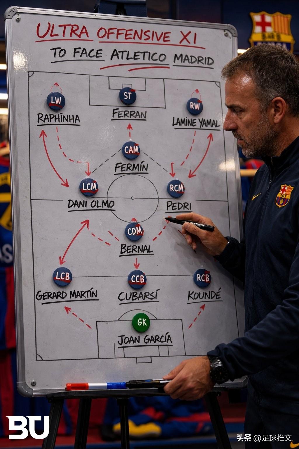 马卡报:西蒙尼将用5-4-1对阵巴萨。 国王杯首回合巴萨0:4告负,次回合再战马竞,巴萨最少要赢马竞4球以上,出线形势可谓岌岌可危。 伟大的克鲁伊夫曾开创3-4-3菱形中场体系,而恩里克曾用此阵型逆转巴黎圣日耳曼。 弗里克称克鲁伊夫是他最重要的偶像之一。如果弗里克在对阵马竞时全力进攻,摆出这套克鲁伊夫式的3-4-3阵型(图一)尝试逆转,会怎样?