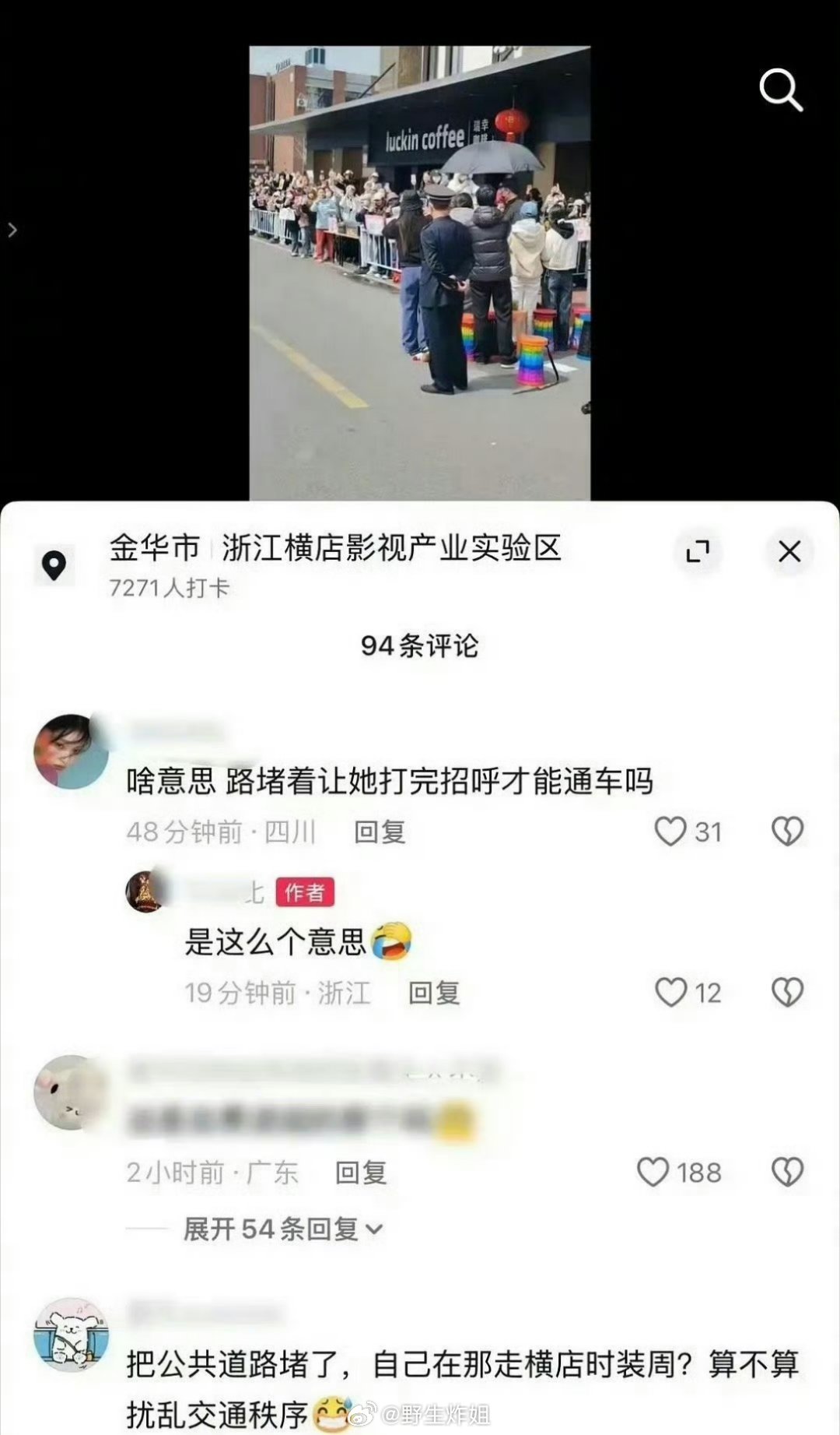 有路人出来吐槽虞书欣在横店拦路堵塞交通了,因为虞书欣要出来跟粉丝打招呼,把横店当