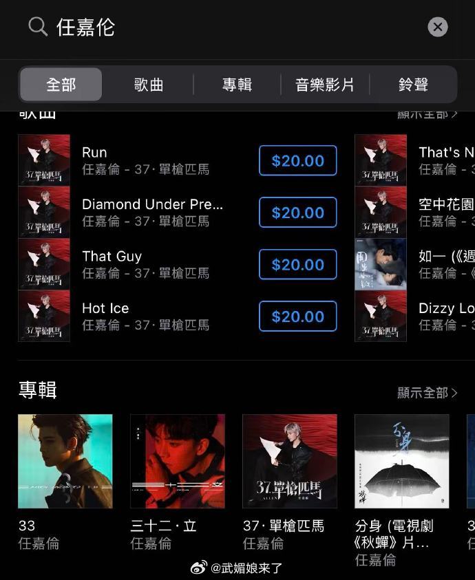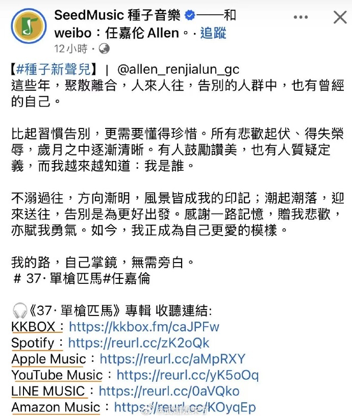 任嘉伦新专辑37单枪匹马任嘉伦新专辑《37单枪匹马》全球上线了!上线全球各大平台,包括Spotify、iTunes、YouTube Music、KKBOX、Amazon Music等。