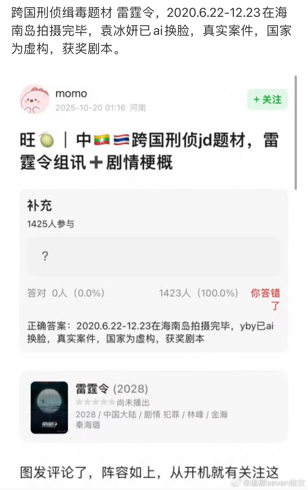 雷霆令25年就传ai换脸了,换脸后去年年底提交终审,被官方锤的fzk别挣扎了,如果真换脸,官博和通稿就不要带这个名字了,毕竟观众对被官方通报的tsls劣迹艺人是零容忍