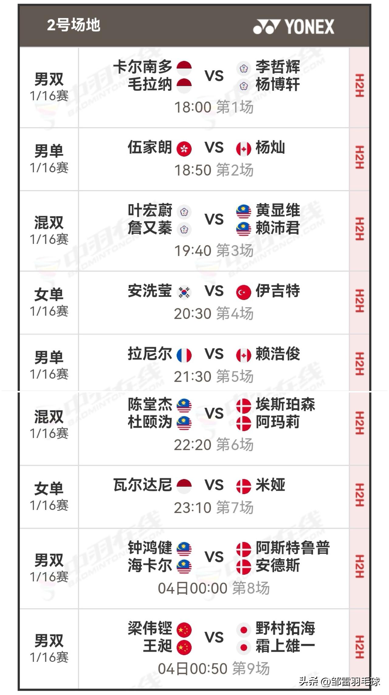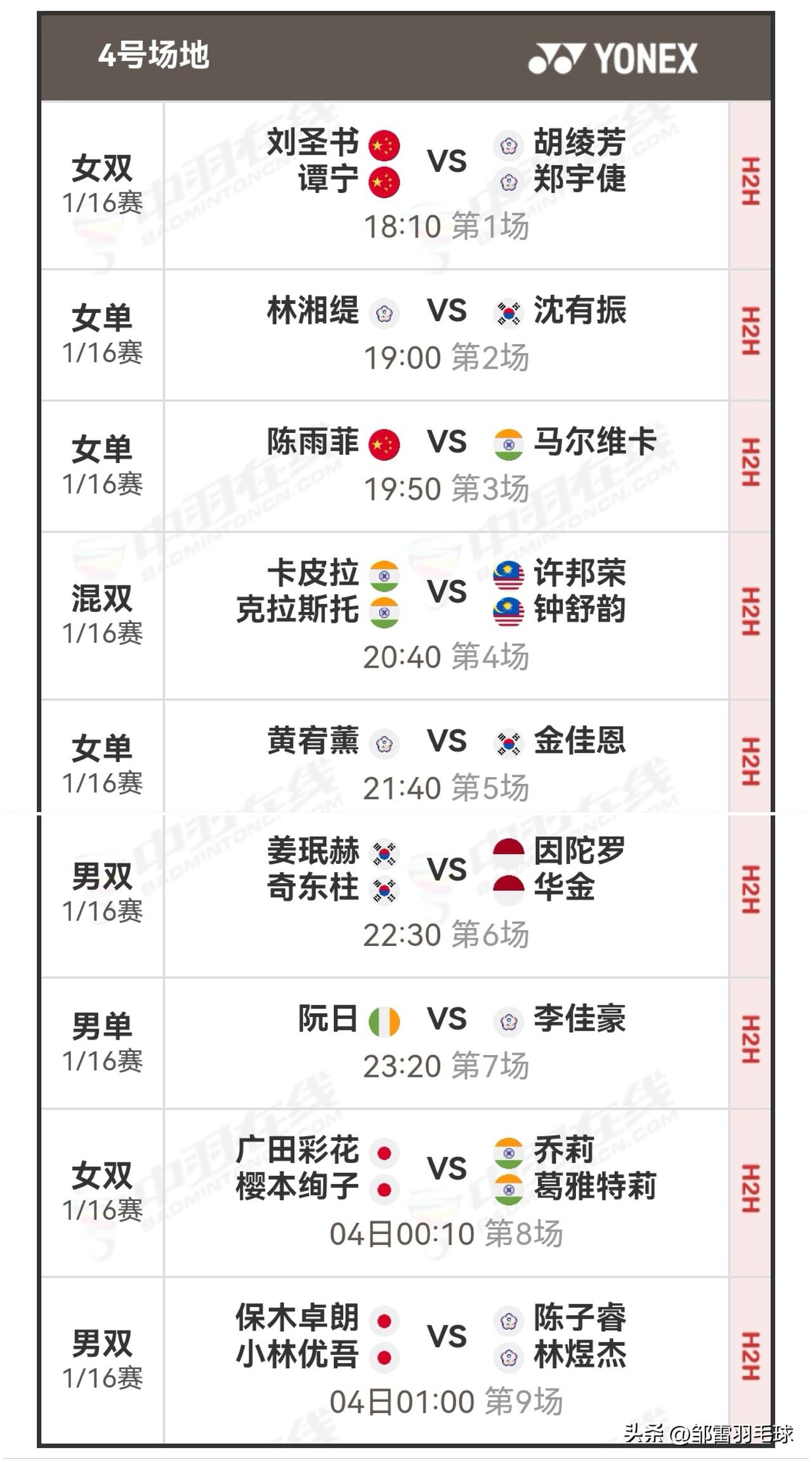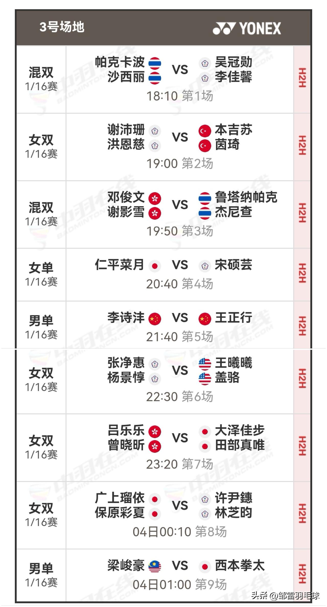 3月3日全英羽毛球公开赛首日赛程安排 今日,2026全英羽毛球公开赛于英国伯明翰拉开战幕。北京时间18:00起,将进行1/16决赛(一),也就是首轮上半区的比赛,届时会有四块场地同时开赛。今日,石宇奇将对阵拉克什亚,翁泓阳会与李卓耀一决高下,李诗沣和王正行将上演内战,梁王组合、陈雨菲、圣谭组合、凡贤组合也将登场出战。关注我,一同为国羽加油鼓劲!详细对阵安排如图。 羽毛球 羽毛球爱好者 羽毛球现在已经是高端运动了吗? 羽毛球比赛 羽毛球赛事 国羽 石宇奇 陈雨菲 国羽加油