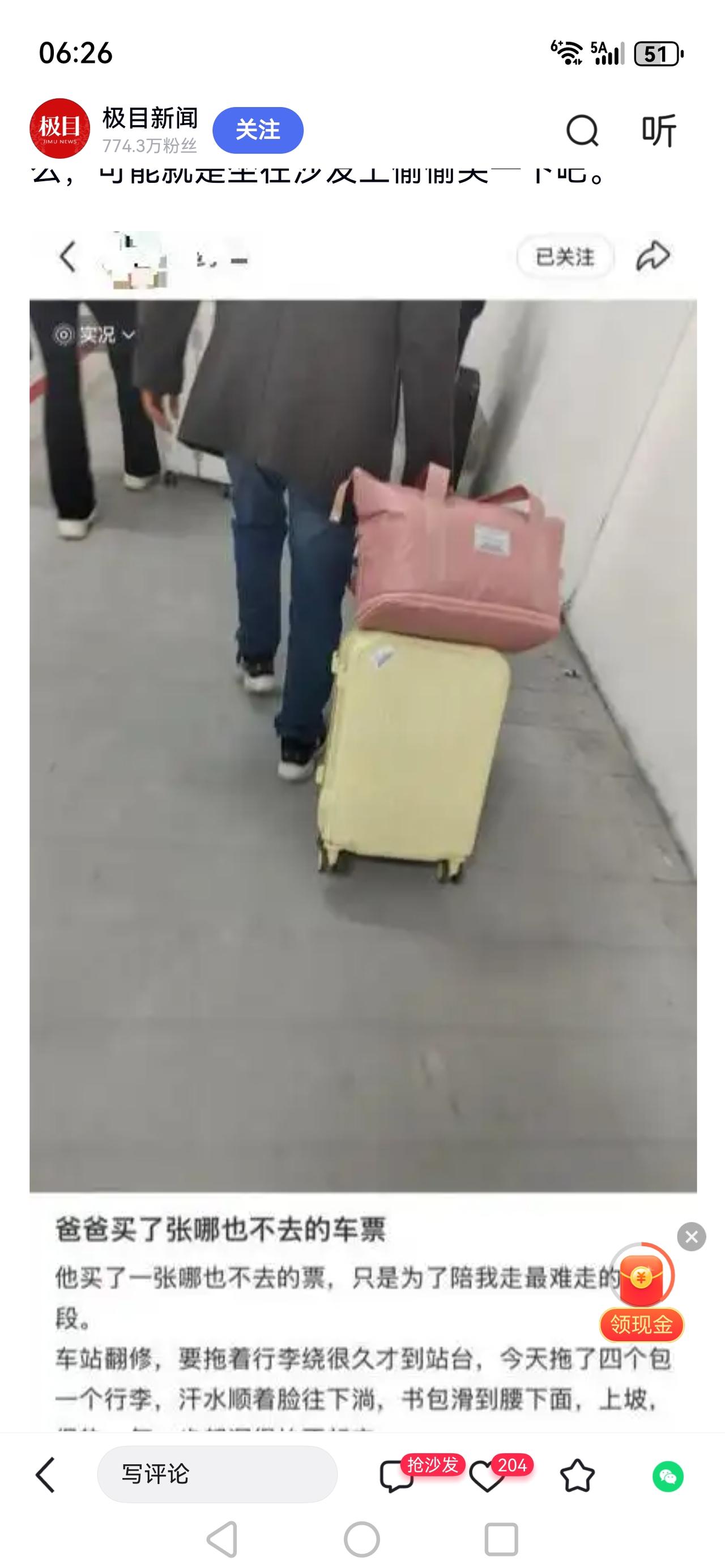 《父亲买短途票送女儿:这张“到不了”的车票,藏着最戳心的爱》 四川南充北站,一张只坐一站的短途车票,没有目的地,却载满了全网破防的父爱。女儿返校遇车站翻修,十几分钟上坡路、四包一箱,寸步难行。本已在进站口分别的父亲,悄悄买票进站,默默扛起所有行李,一路护送上车、安放妥当,才轻描淡写说出缘由。他来时空手,走时空手,却替女儿扛下了最沉的负担、最难走的路。 这不是煽情剧本,是最真实的中国式父爱。父亲从不说爱,却把牵挂藏在每一个务实行动里:不麻烦工作人员,不搞特殊,用一张合规车票,换女儿一路轻松。他们不善言辞,不懂表达,却总在你最狼狈、最吃力的时候,悄无声息出现,挡下风雨、扛起重量。这不是惊天动地的壮举,却是刻进骨子里的守护——我不打扰你的远行,只愿你前路无负重。 看完真的泪目!这哪里是一张车票,分明是父亲沉甸甸的牵挂。我们总觉得父亲严厉、沉默,却忘了他的爱从不在嘴上,全在行动里。小时候他扛着我们长大,长大后他默默扛走我们的疲惫与艰难。多少人离家时,嫌父母啰嗦、送得太远,回头才懂,那一次次目送、一程程陪伴,都是藏不住的爱。别等远行才想起珍惜,常回家看看,多给爸妈打个电话,别让爱只剩目送。你被这份父爱戳中了吗?评论区说说你和父亲的暖心故事~热点话题 父亲短途车票送女儿