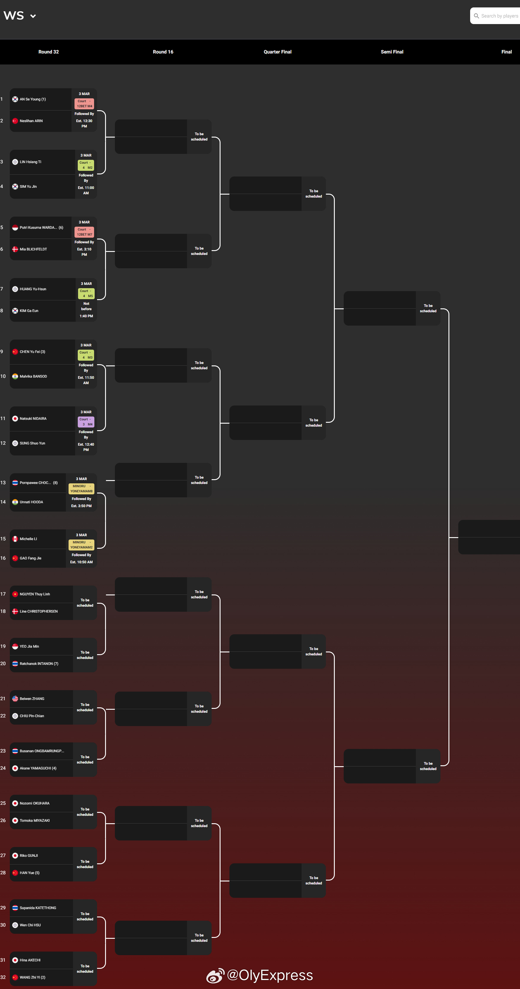 【2026全英公开赛签表】2026全英羽毛球公开赛羽联超级赛 3月3-8日,总奖金额为145万美元的2026世界羽联超级1000全英公开赛将在伯明翰举行。国羽参赛队员如下,签表见图:男单:石宇奇、李诗沣、陆光祖、翁泓阳、王正行女单:王祉怡、韩悦、陈雨菲、高昉洁男双:梁伟铿/王昶、陈柏阳/刘毅女双:刘圣书/谭宁、贾一凡/张殊贤、李怡婧/罗徐敏混双:冯彦哲/黄东萍、蒋振邦/魏雅欣、郭新娃/陈芳卉、程星/张驰、高家炫/吴梦莹
