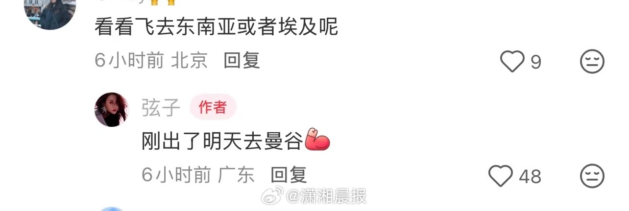 【#弦子将从阿曼前往泰国曼谷#,#弦子说想跟着ip回到中国#】3月3日,弦子在社交平台回复网友,称迪拜回北京的4号航班取消了,已到达阿曼,将飞往泰国曼谷。其ip显示广东,老公李茂ip显示北京,回应称“真想跟着ip回去”。#弦子报平安#