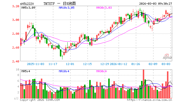 3月3日,TMTETF(512220)开盘涨0.00%,报3.075元。TMTETF(512220)重仓股方面,中际旭创开盘涨0.04%,新易盛涨0.00%,立讯精密涨0.10%,寒武纪涨0.43%,工业富联涨0.56%,中芯国际涨0.62%,海光信息跌0.45%,北方华创涨0.04%,胜宏科技涨1.26%,兆易创新涨0.63%。