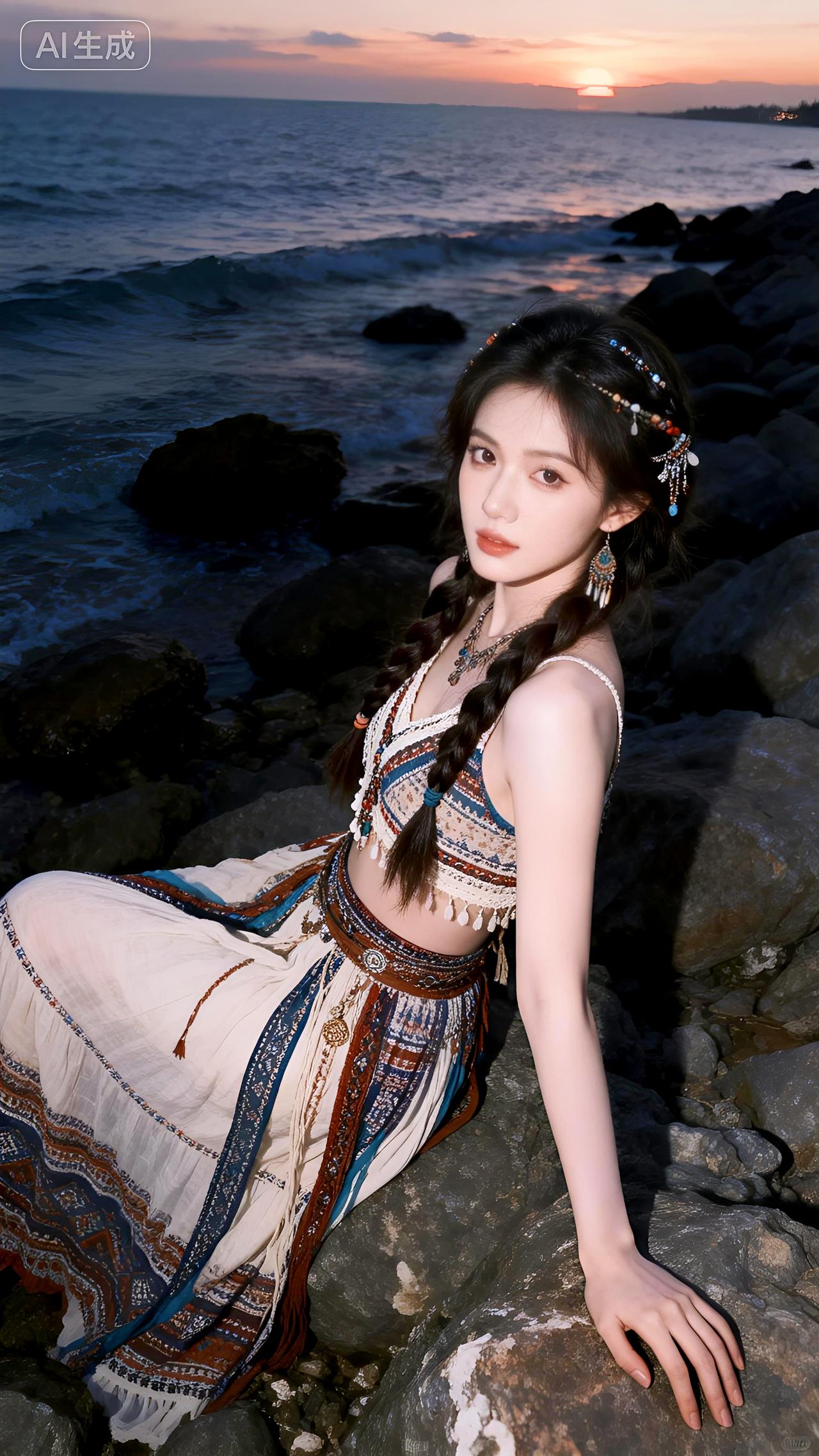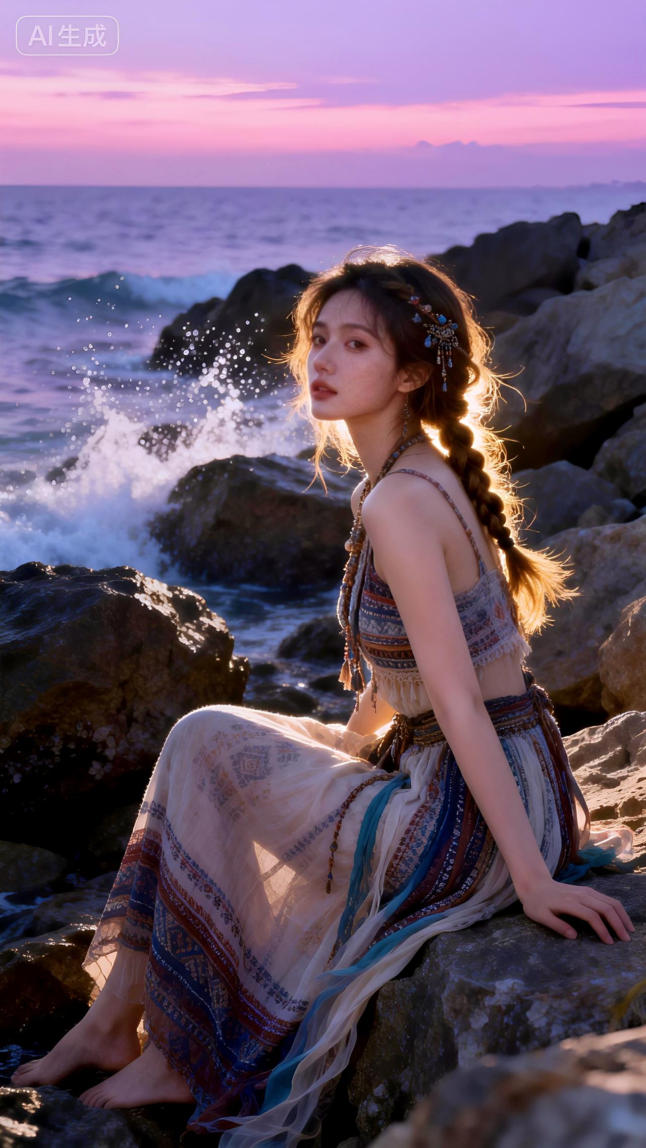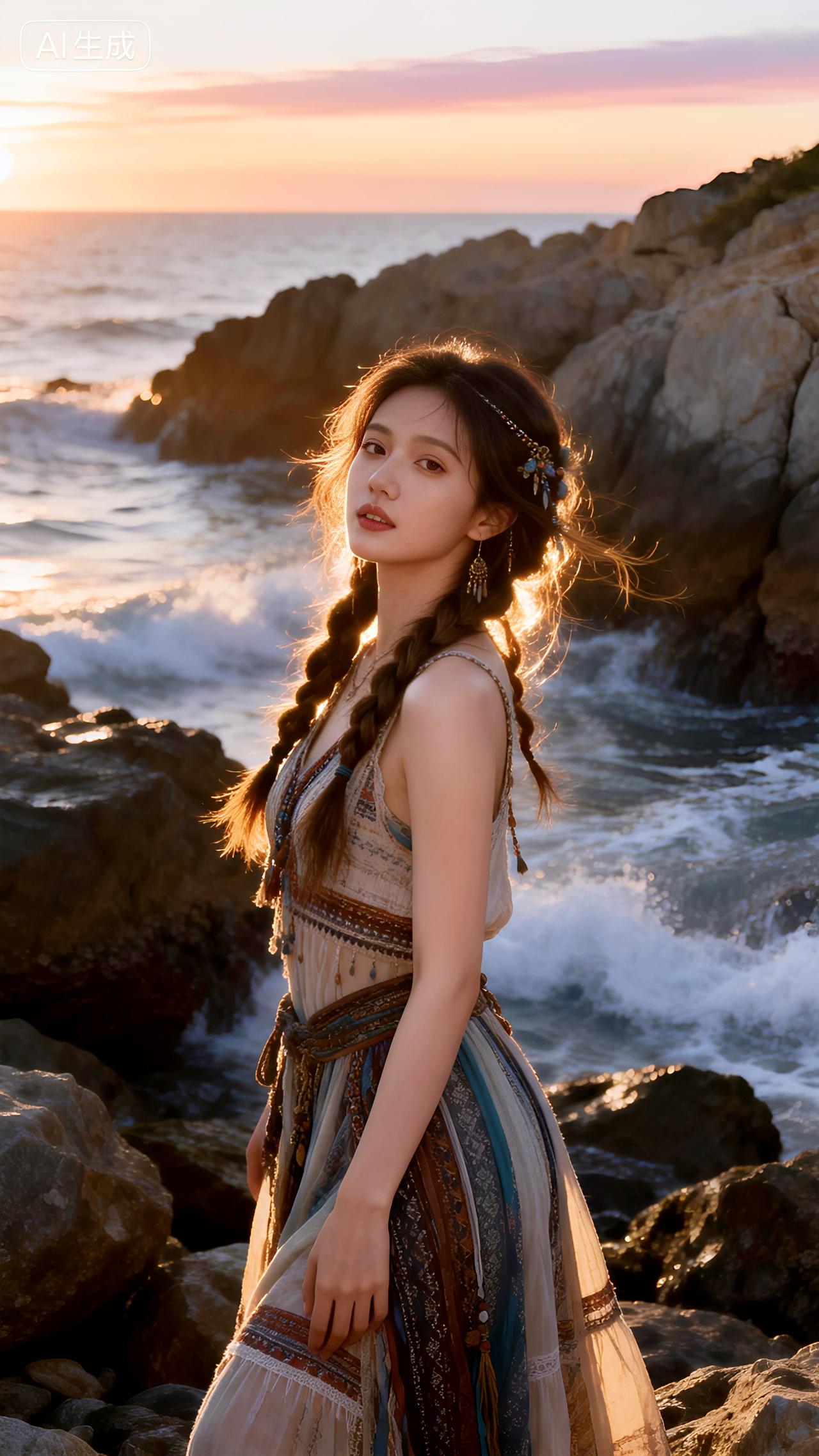 黄昏的海风轻拂,她身着波西米亚长裙站在礁石旁,发丝飞舞如诗如画。豆包 即梦 壁纸