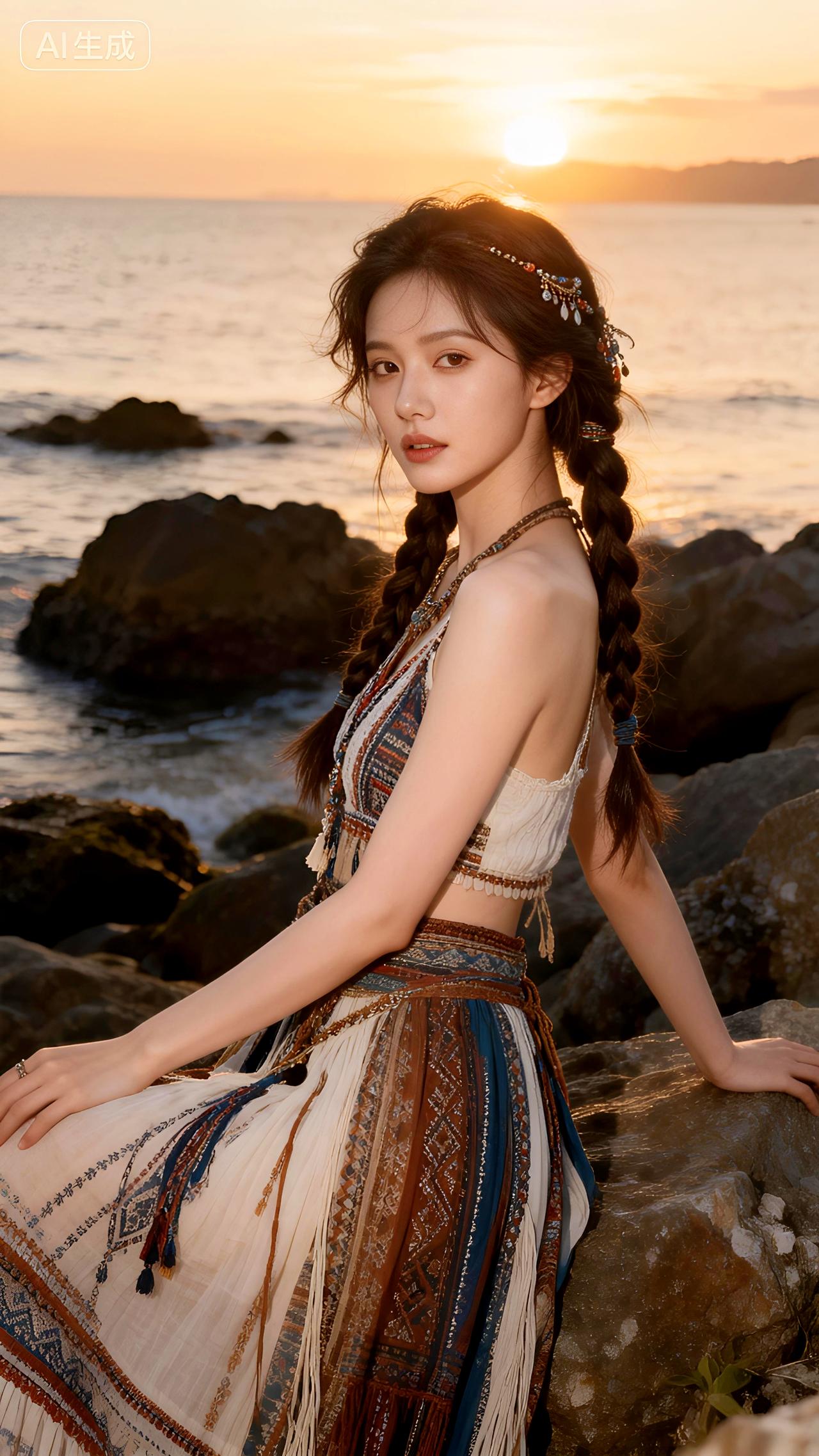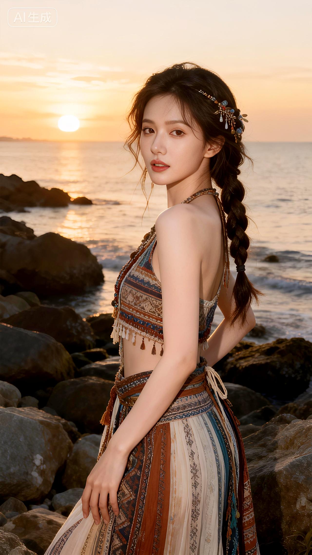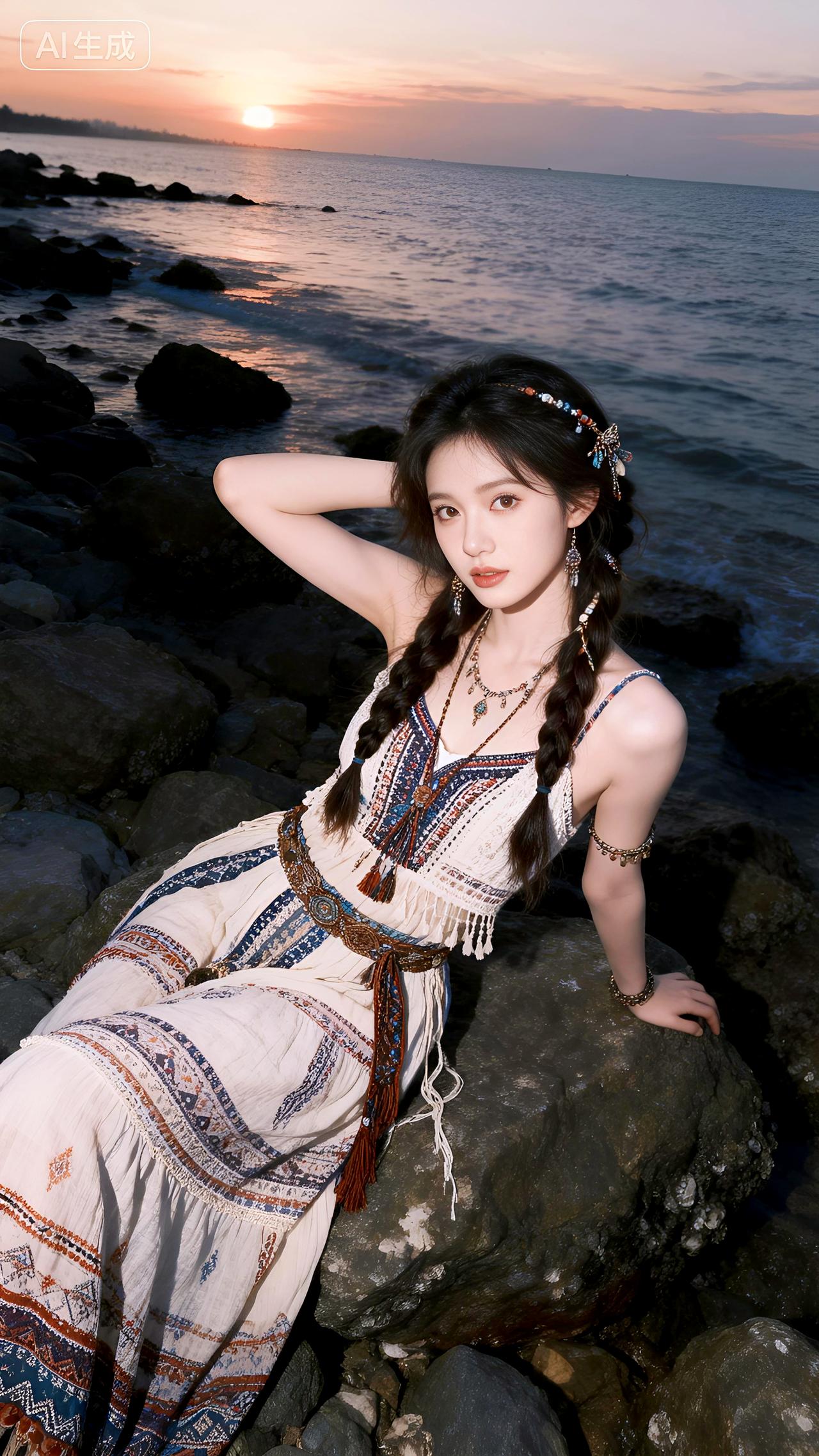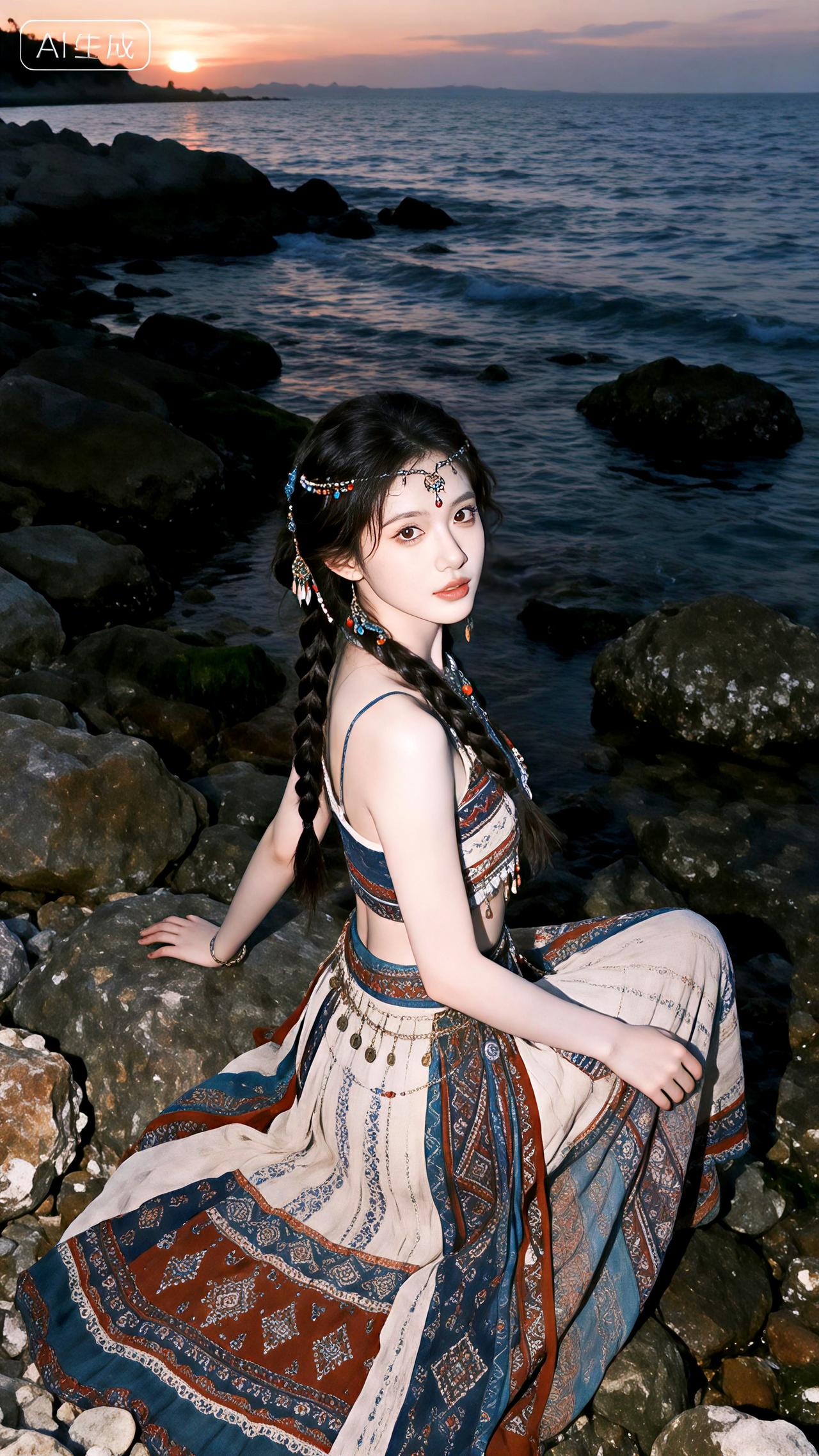 黄昏的海风轻拂,她身着波西米亚长裙站在礁石旁,发丝飞舞如诗如画。豆包 即梦 壁纸
