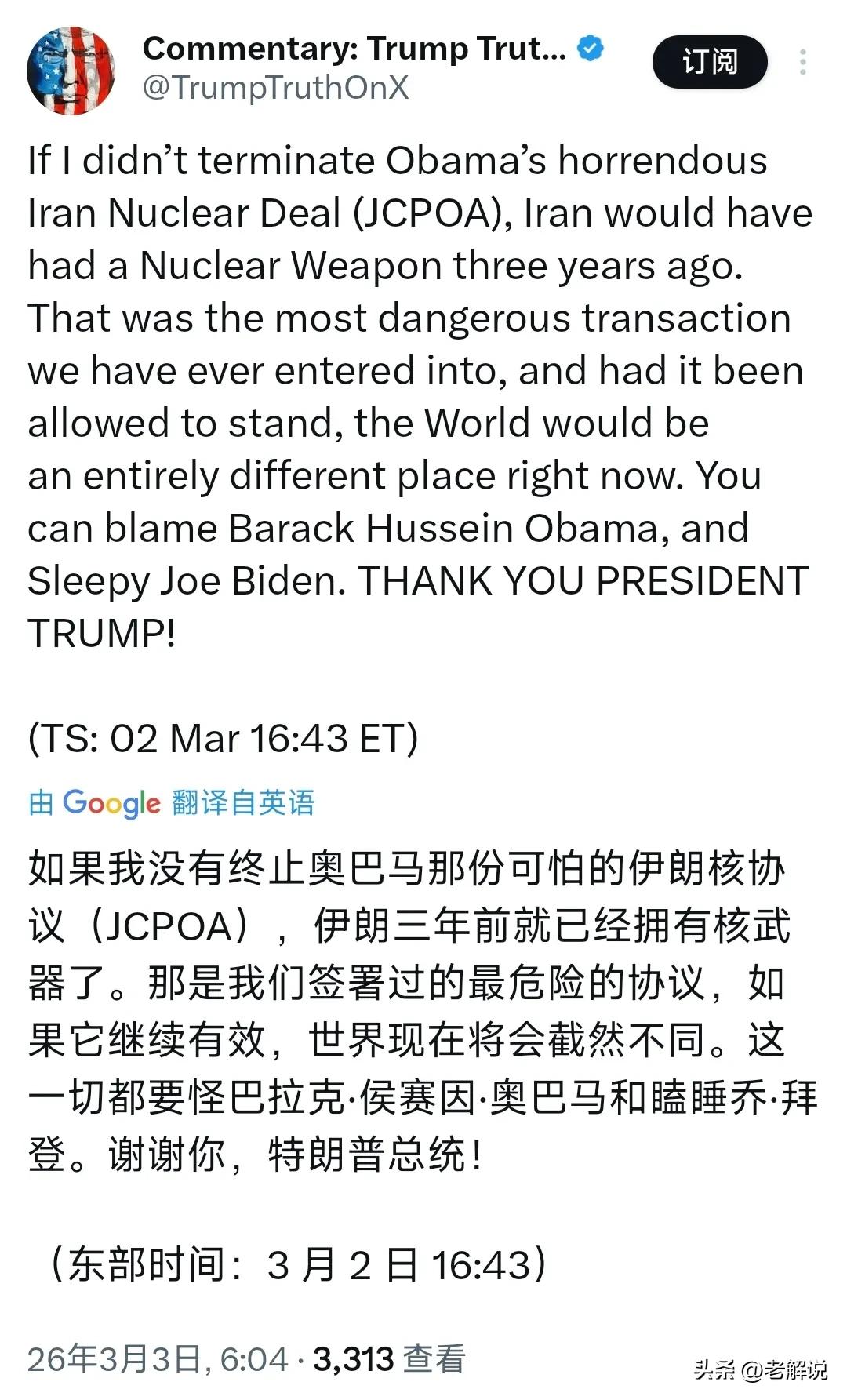 特朗普今天(北京时间3月3日)发文写道:“如果我没有终止奥巴马那份可怕的伊朗核协议(JCPOA),伊朗三年前就已经拥有核武器了。那是我们签署过的最危险的协议,如果它继续有效,世界现在将会截然不同。这一切都要怪巴拉克·侯赛因·奥巴马和瞌睡乔·拜登。谢谢你,特朗普总统!” 特朗普总统这大早晨的发文,乍一看气势汹汹,逻辑却跟小孩吵架似的——“要不是我当年把桌子掀了,你们早就吃不上饭了”。问题在于,掀桌子之前,大家本来正好好吃着饭呢。 咱们先把时间线捋清楚,这事儿就藏不住典型的“特朗普式逻辑”:先把功劳揽到自己身上,前提是得先把锅甩给前任。 他口中的“可怕的伊朗核协议”,也就是JCPOA,是2015年奥巴马在任时,由中美俄英法德六大国共同跟伊朗签的。 当时国际核查人员天天盯着,伊朗的确履行了协议,把离心机拆了、浓缩铀库存也稀释了,核计划基本处于“冷冻”状态 。可以说,那几年虽然美伊关系不咋地,但起码核问题没炸雷。 可到了2018年,特朗普在第一任期时,硬是说这协议不好,单方面退出了,还对伊朗搞“极限施压” 。 结果呢?伊朗一看你不守信用,我也不忍了,慢慢就开始重启更高浓度的铀浓缩,核研发进度条反而开始狂飙。 所以现在他说“如果不退出,伊朗三年前就有核弹了”,这话确实经不起推敲。正是因为他退出,才把伊朗从那协议里彻底解放了出来 。 那为啥他现在要跳出来说这话? 大家可能也看到了,这两天美国和以色列对伊朗发动了大规模军事打击,代号“史诗怒火”,连伊朗最高领袖哈梅内伊都被确认遇袭身亡了,局势彻底炸了锅 。 这种时候,特朗普作为下令的总统,必须得给国内老百姓一个说法,证明“为什么我的手里沾满了鲜血”。 他的逻辑就是:我打你,是因为防着你造核弹。顺便再踩一脚前任奥巴马和拜登,说都是你们太软才留下的烂摊子,我是个硬汉,来给你们擦屁股。他故意把奥巴马的全名“巴拉克·侯赛因·奥巴马”拎出来,还有“瞌睡乔”,这完全是竞选集会的口吻,就是要把对外战争包装成对内政治斗争 。 但现实非常打脸。就在他发文自我表扬的同时,美军已经有6名士兵在这场冲突中阵亡了 。按他这个“功劳簿”的记法,这6条命的账又该记在谁的头上? 再看看现在的局面:霍尔木兹海峡被伊朗封锁了,全球油价要飙,中东又要陷入泥潭 。特朗普虽然嘴上说预留了“退路”,能在两三天结束战斗,可一旦把伊朗那个极其复杂的政权体系打散,接下来等着美国的,可能是比伊拉克战后更乱的无政府状态 。 所以,看特朗普这段话,不能只看前半句那个耸人听闻的“核武器”,得看后半句——“世界现在将会截然不同”。 他说对了,现在的世界确实截然不同,但不是因为核协议没撕,而是因为协议撕了、战争来了、人死了。 感谢你,特朗普总统?感谢你让中东再一次炸开了花 。[尬笑]