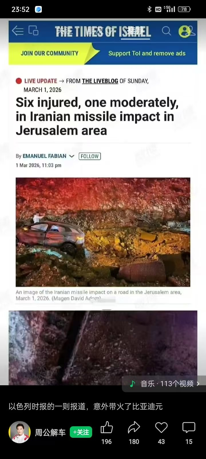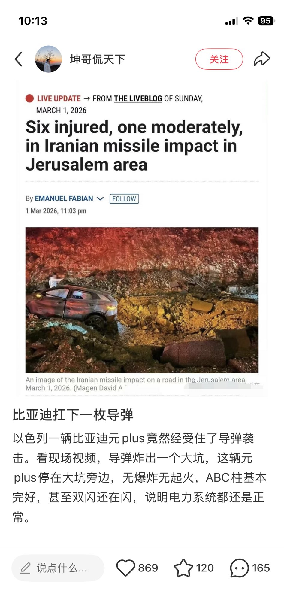比亚迪元plus贴身挨了一发导弹 俯视角度很清晰,掉落在耶路撒冷 炮弹,落的位置就在车后面这辆Atto3(国内元Plus)在受到高爆攻击后,做出令乘员最保命的操作——车辆整体车身结构未发生坍塌,安全气囊全部展开,双闪打开,车门正常开启,未出现起火、热失控等危险情况,车上共有5名乘员,其中司机受中度伤,两人受轻伤,另有两人受惊吓,无人员死亡。在这个战火连天的2026年,能在导弹坑边推开车门走下来的车,本身就是最好的实力证明。再联想到前阵子广西那辆连遭三次雷劈依然能跑的比亚迪,网友直呼这哪是买菜车,这分明是末日生存装备啊新能源汽车 PS:比亚迪在以色列是纯电市场长期销冠,并曾拿下全品类单月总销冠,是当地电动车标杆品牌,2026 年 1 月销量 2,474 辆,同比 + 27%,市占率 5.9%,位列品牌第 7。