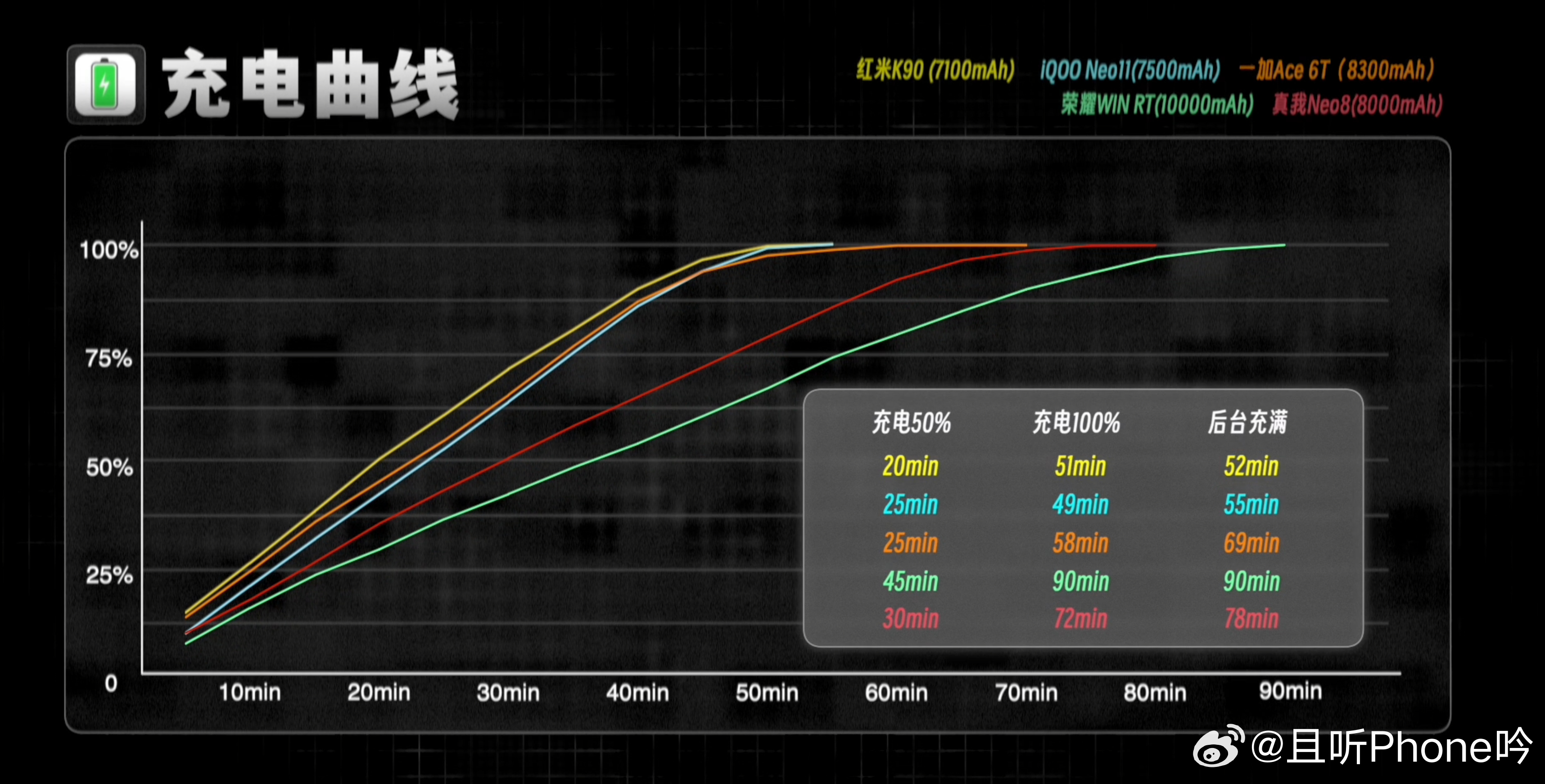 快充方面(图4),除真我是80W有线外,其它四台手机均为100W。实测红米电池最小充的也最快,只需52分钟就能充满,其次是iQOO,55分钟充满也很快。两台绿厂机型虽然瓦数不同,但速度并没有差太多。荣耀大电池,完全充满则需要90分钟。
