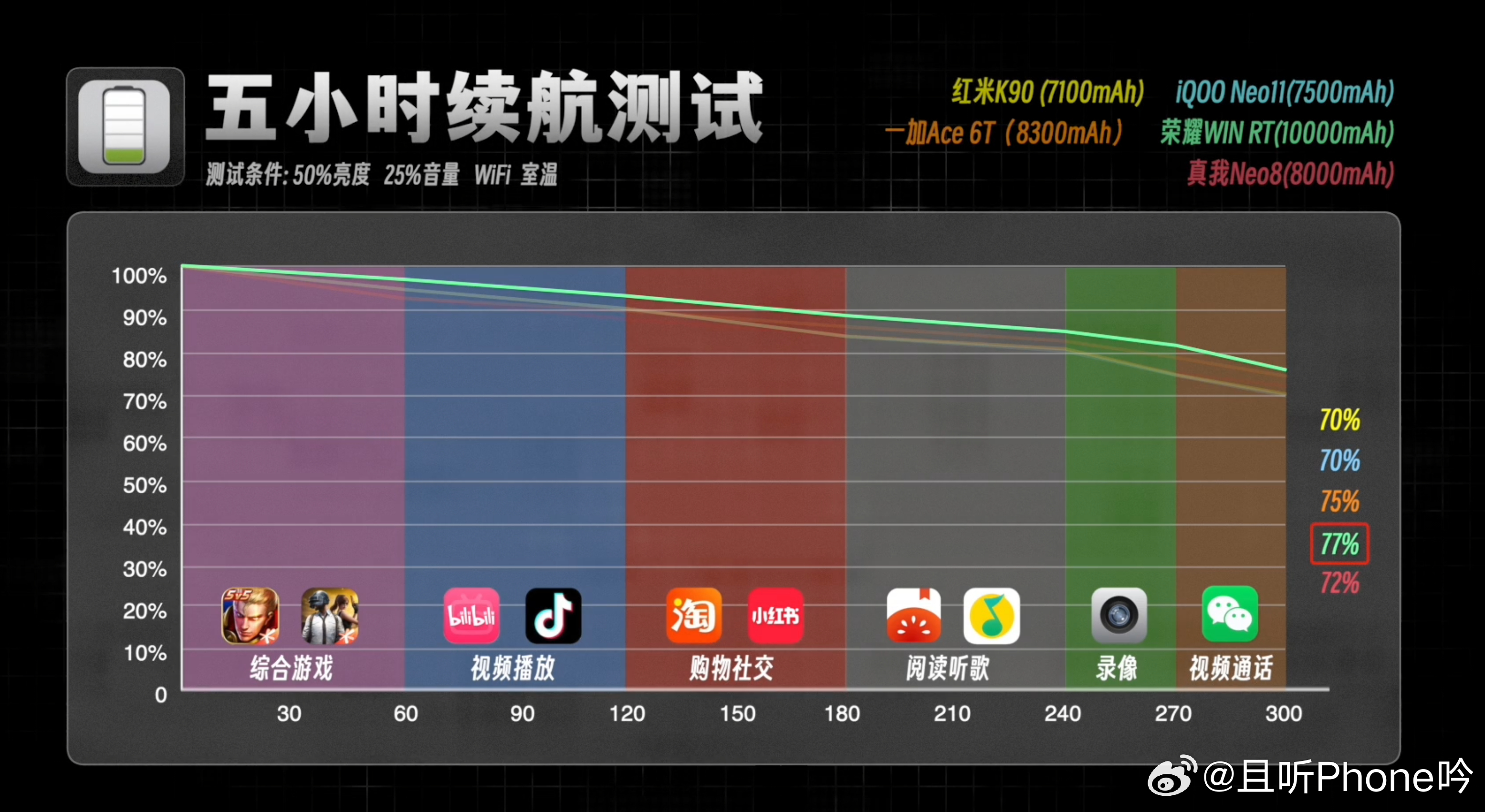 五小时续航测试(图2),荣耀这块大电池剩余77%,毕竟都赶上充电宝了,第一没啥意外。然后是两台绿厂的机型一加和真我,分别剩余75%和72%。iQOO因为2K屏的原因,和小屏红米都是剩余70%。